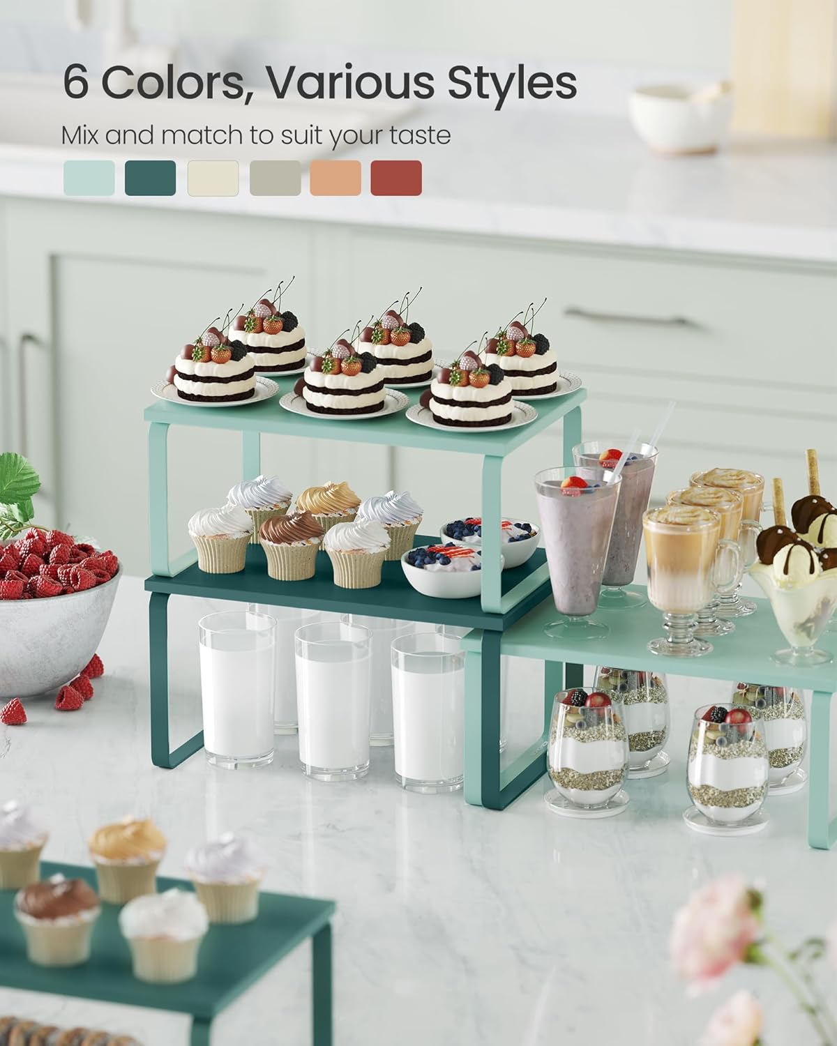 SONGMICS Cabinet Organizer Shelf, Set of 2 Kitchen Counter Shelves, Kitchen Storage, Spice Rack, Stackable, Expandable, Metal and Engineered Wood, Moonlight Green UKCS002C01