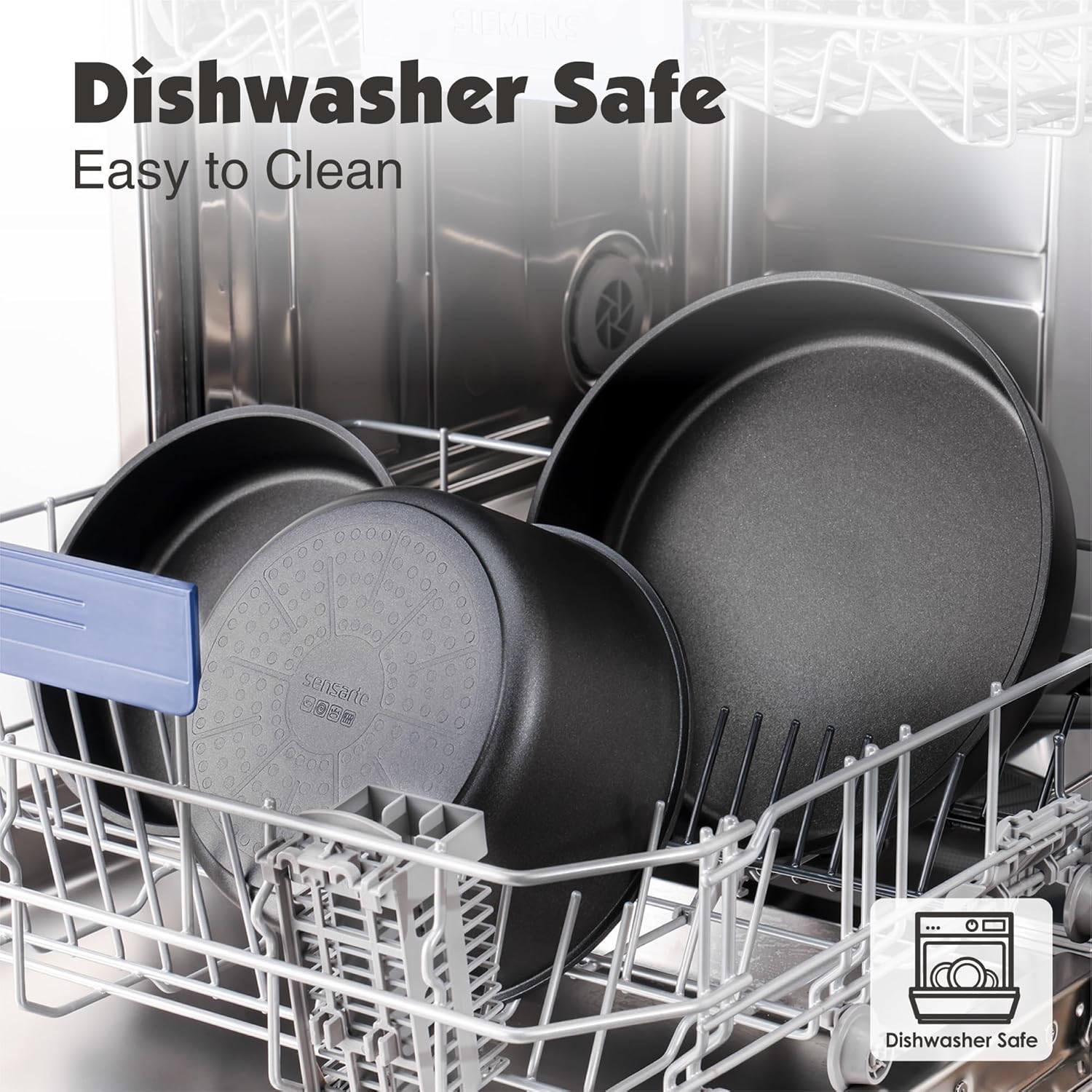 - Dishwasher Safe - Cleaning is a breeze. Professional wear-resistant design for the bottom of the pan set that prevents black residue even when used in the dishwasher.