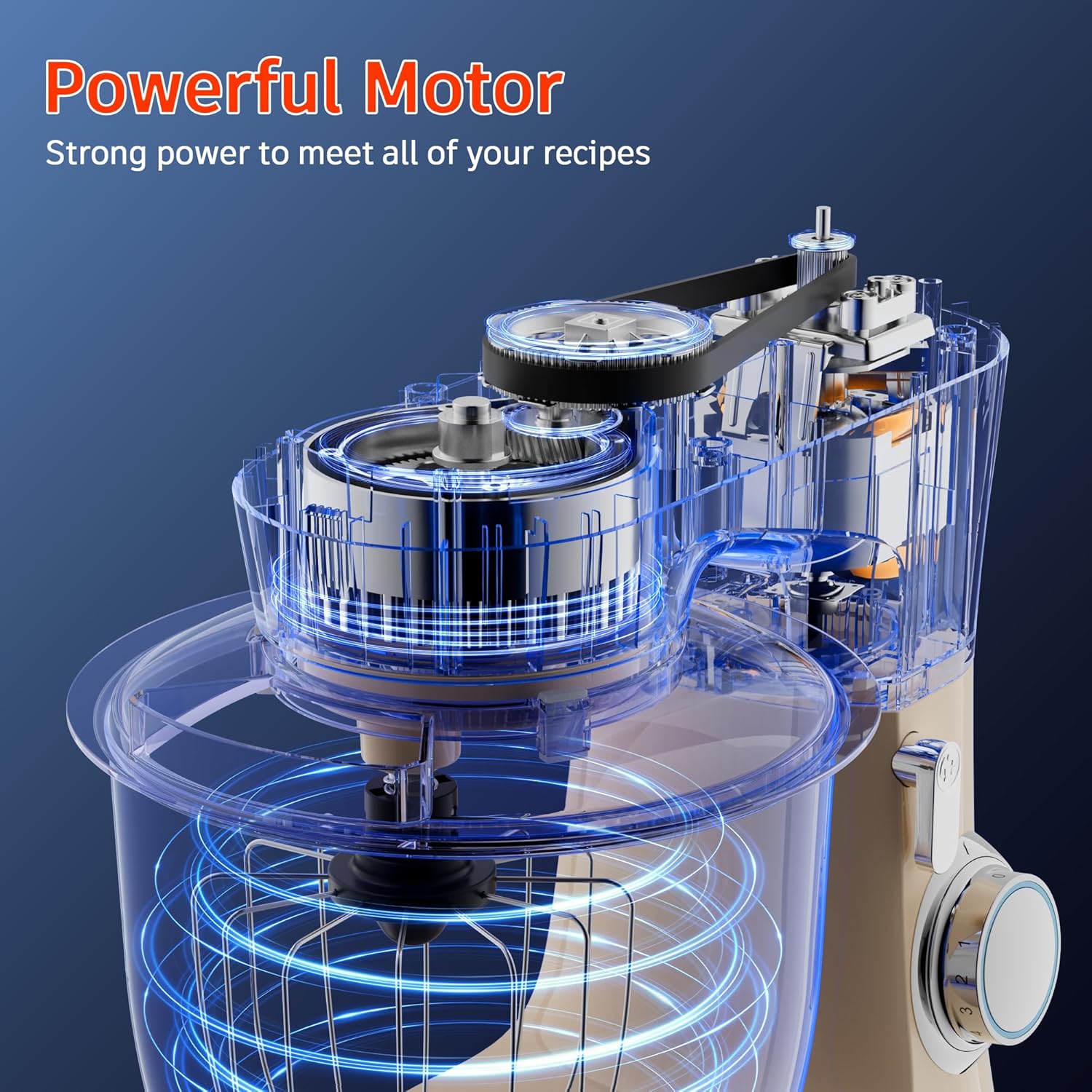 - Upgraded Multi Attachments – Die-cast dough hook and flat beater, stainless steel whisk are easy to attach, using upgraded material, more sturdy and durable. There is a gasket at the top joint to prevent food residue from splashing into the joint to make cleaning more convenient.