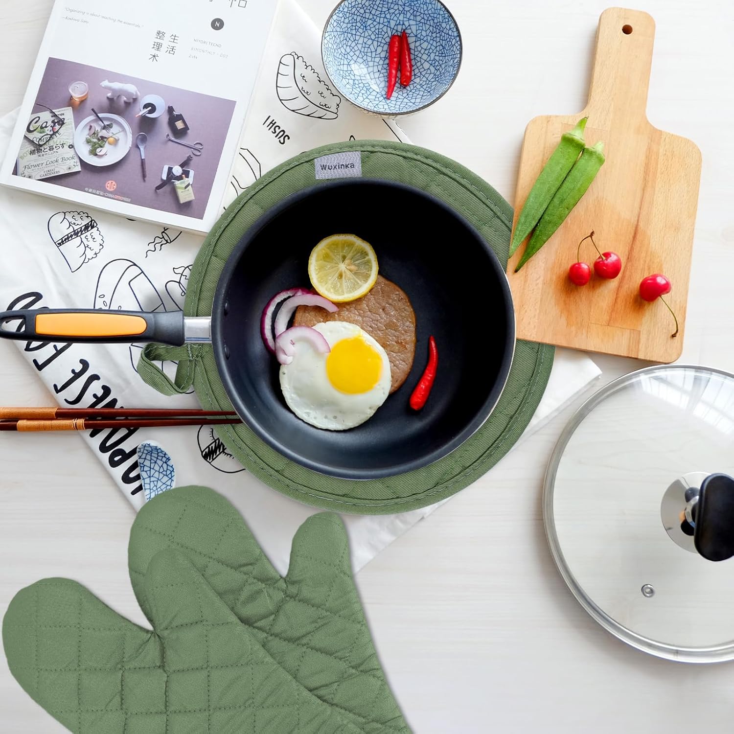 Set of 4 Oven Mitts and Pot Holder Heavy and Tall Kitchen Cotton Gloves Lined Towelcloth, Gloves Length 40cm, Pot Holder Width 20cm Diameter Round… (Army Green)