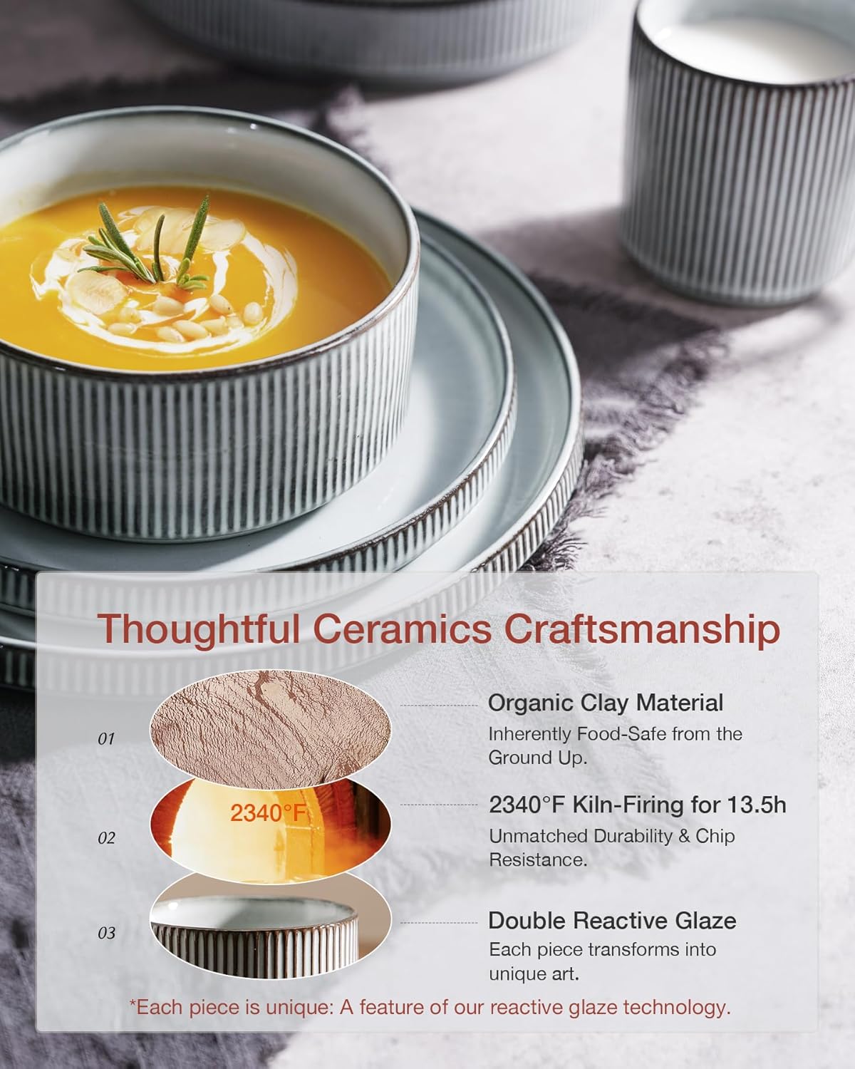 - [Everyday dinnerware]: Our premium stoneware dinnerware crafted from organic and natural clay, is LEAD-FREE and CADMIUM-FREE. It ensures safety for both your family and the environment. You can savor all kinds of meals, including steaks, salads, and desserts, with complete confidence