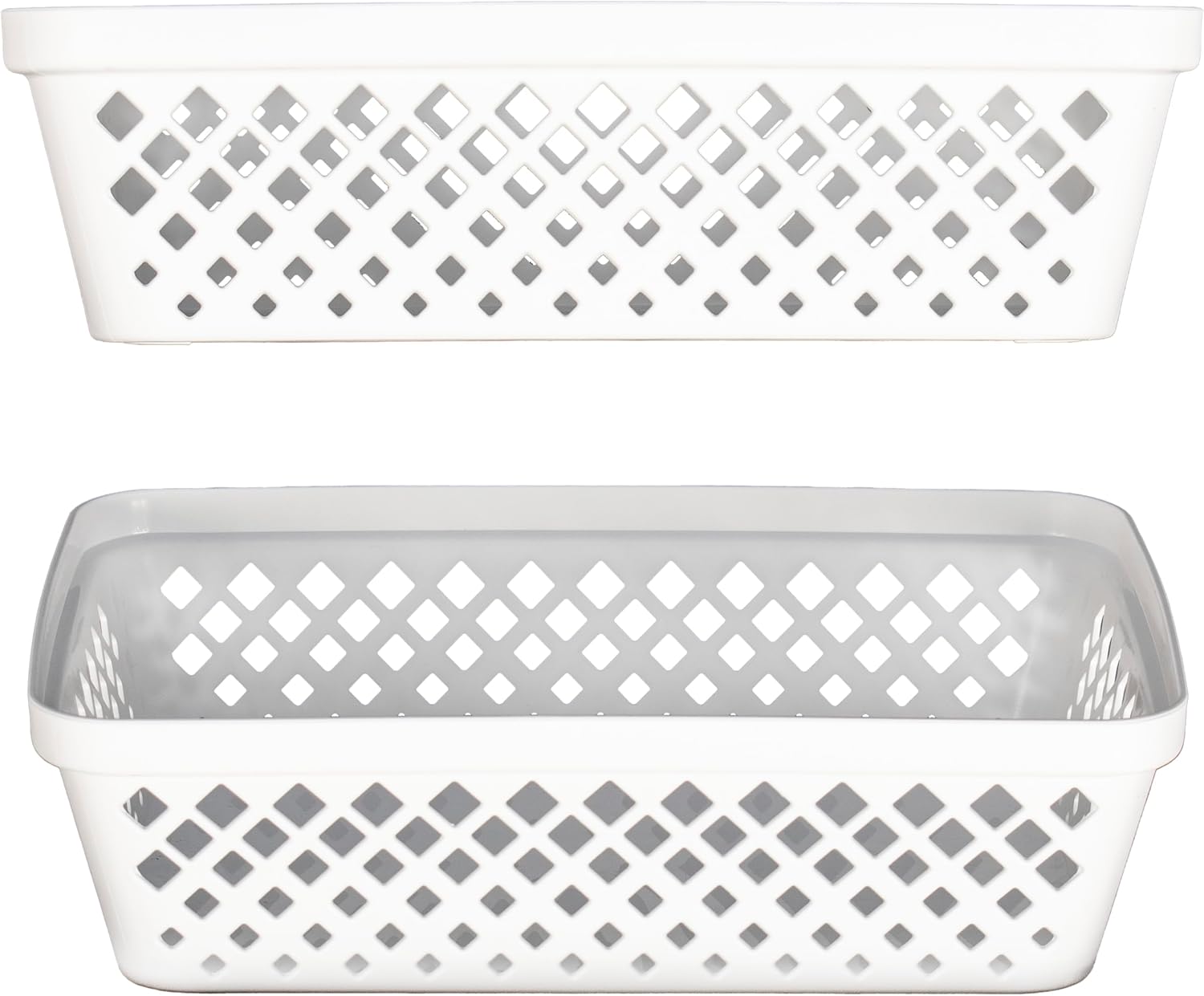 - DURABLE & LIGHTWEIGHT - Decorative storage baskets are easy to move and designed to last. Bathroom storage containers boast a sturdy yet lightweight plastic build, decorative diamond design, and neutral white color.