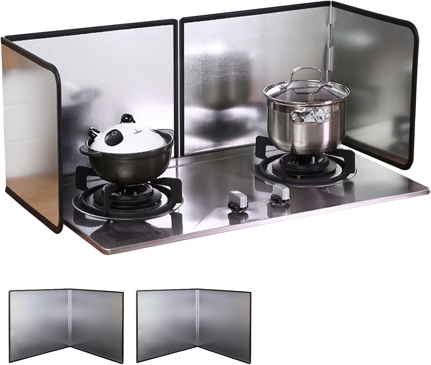 - Easy to clean Splash Guard:stainless steel surface makes it more easily to be cleaned. After using the oil splatter guard backsplash panel, just use a wet cloth to bedew with warm soapy water or detergent, then wipe on the steel plate directly or rinse under the running water, keep your kitchen clean and tidy and save the time and effort of wiping kitchen grease.