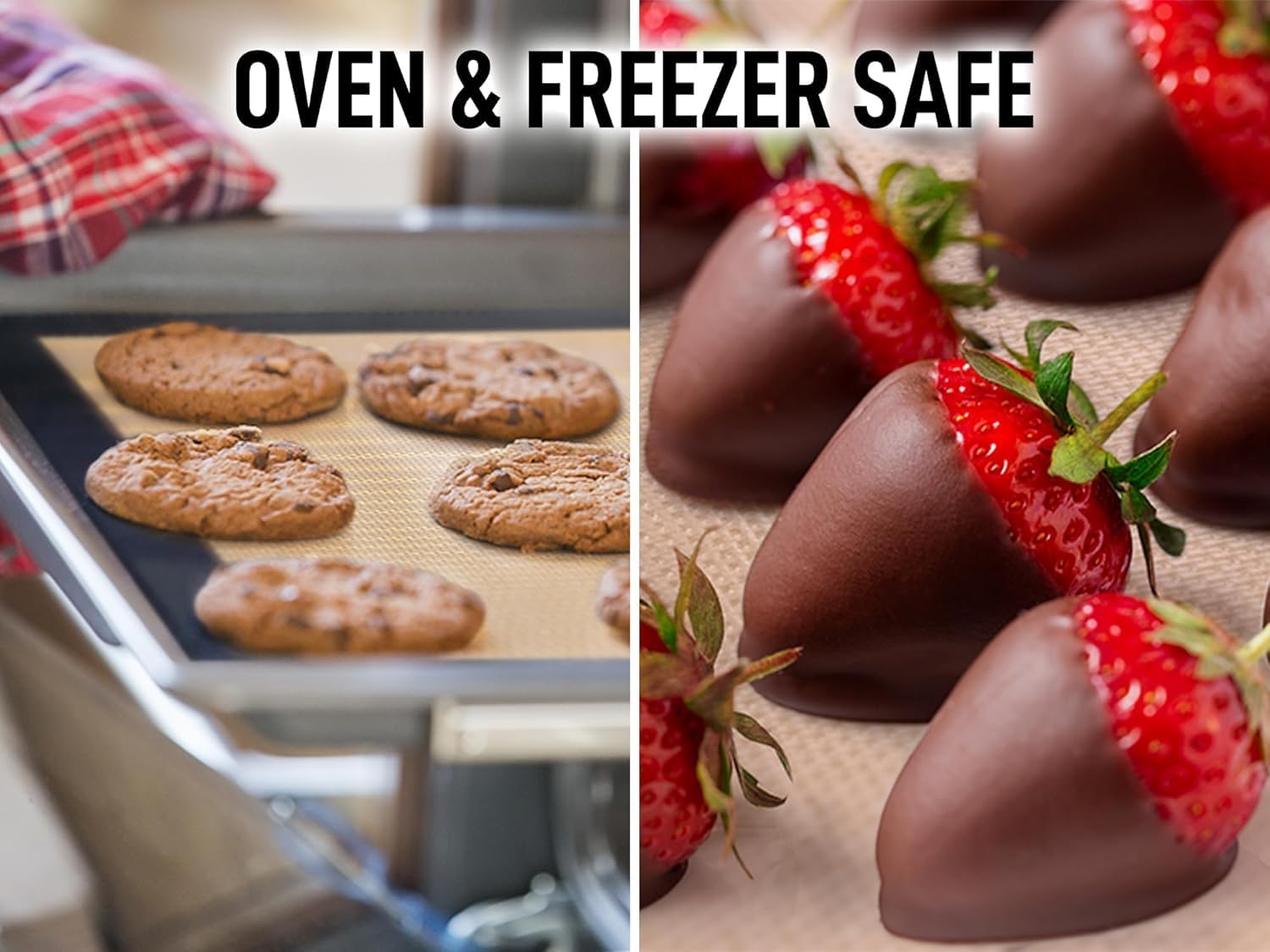 - DURABLE & FOOD-SAFE SILICONE: Crafted from premium food-grade silicone, these baking mats are strong, flexible, and can handle temperatures up to 480°F. Use them in ovens, microwaves, and freezers with confidence. Designed for long-lasting durability, our mats are scratch-resistant and BPA-free - No plasticky aftertaste.