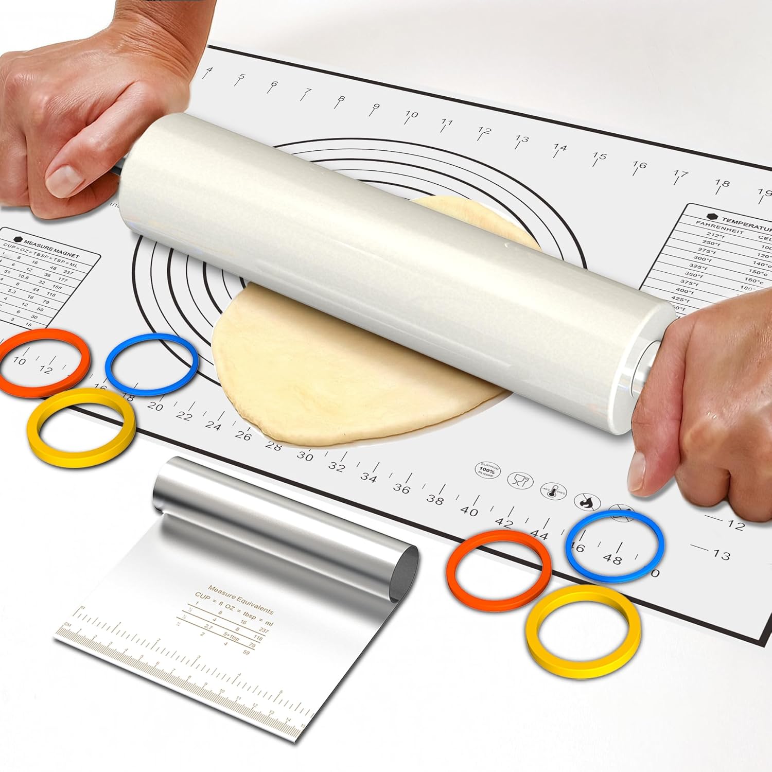 - 🍕【3 THICKNESS RINGS AND PASTRY MAT WITH CUTTER】1/16“ (2mm), 1/6” (4mm) and 1/4” (6mm) thickness rings of different diameters allow the rolling pin to roll out dough of different thicknesses. Pastry mat fits neatly on the table for easy storage. Stainless steel cutter efficiently distributes the size of dough for different needs. Wooden stand is suitable for marble rolling pins and holds it in place to prevent the rolling pin from breaking from unintentional rolling. Overall dimensions - 18.5 in. x 2.5 in. x 2.5 in.