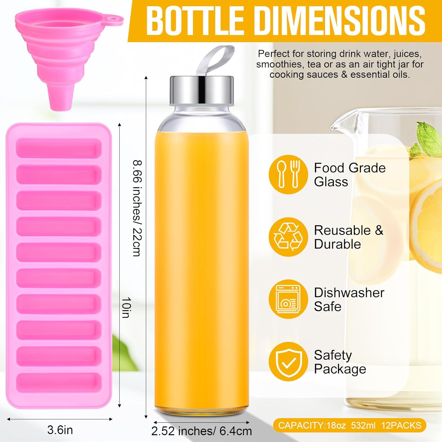 Honeydak 12 Pcs 18 oz Glass Water Bottles Glass Juice Bottles with Protection Sleeves, Stainless Steel and Bamboo Lids Reusable Glasses Funnel, Ice Mold, Brush for Milk Smoothie Beverage Tea