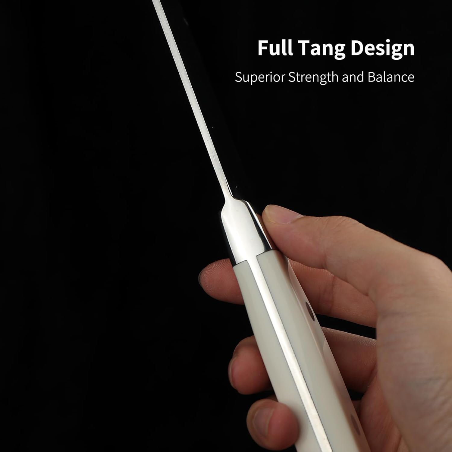 • Pure White Handle - White ABS handle is simple, beautiful and fresh. And it is comfortable to hold and non-slip, easy to wash and clean. Thick and sturdy bolster and finger guards minimize fatigue and avoid damage to fingers. The weighted knife butt keeps the weight well balanced.