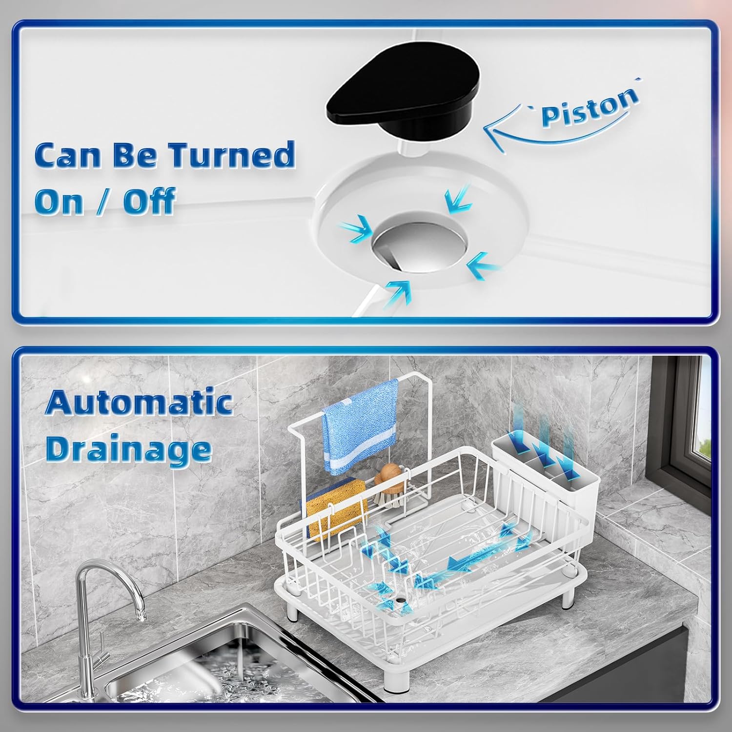 Compact Dish Drying Rack, Dish Drainers for Kitchen Counter with Sponge Rack, Kitchen Drying Rack with Drainboard, Utensil Holder and Automatic Drainage Drainboard, White