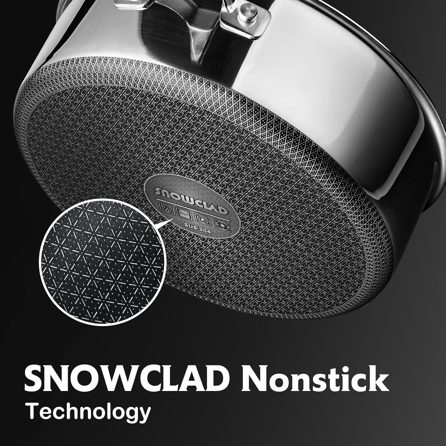 - 【SNOWFLAKE TECHNOLOGY】Our design is created through a laser etching process to provide both stainless steel and non stick surface. This dual surface allows to cook with less oil, grease, and butter.Our clad surface is 50% more than usual Hex surface non stick frying pans.