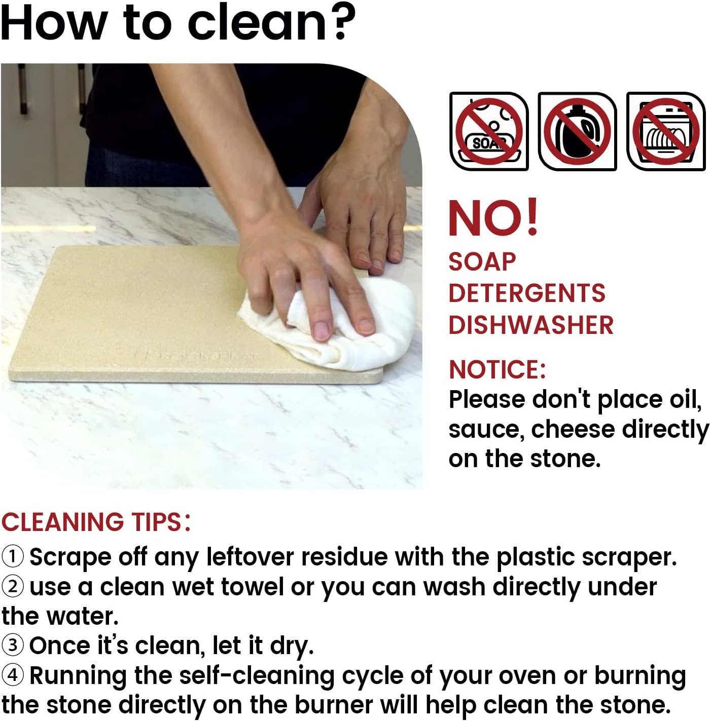 - FDA, RoHS, LFGB, etc CERTIFICATED. This stone is burned in 2200β kiln, it doesn't contain any harmful substance and has no odor. (Never use soap or detergent to clean the stone! Never season cordierite stone with oil or grease)