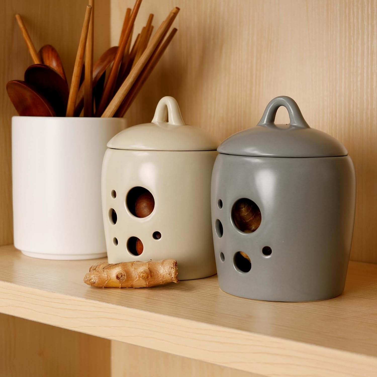- Elegant Grey Ceramic Design: Made from premium gray ceramic, this garlic container storage boasts a sleek and elegant look that complements any kitchen dΓ©cor, serving as both a functional and decorative piece