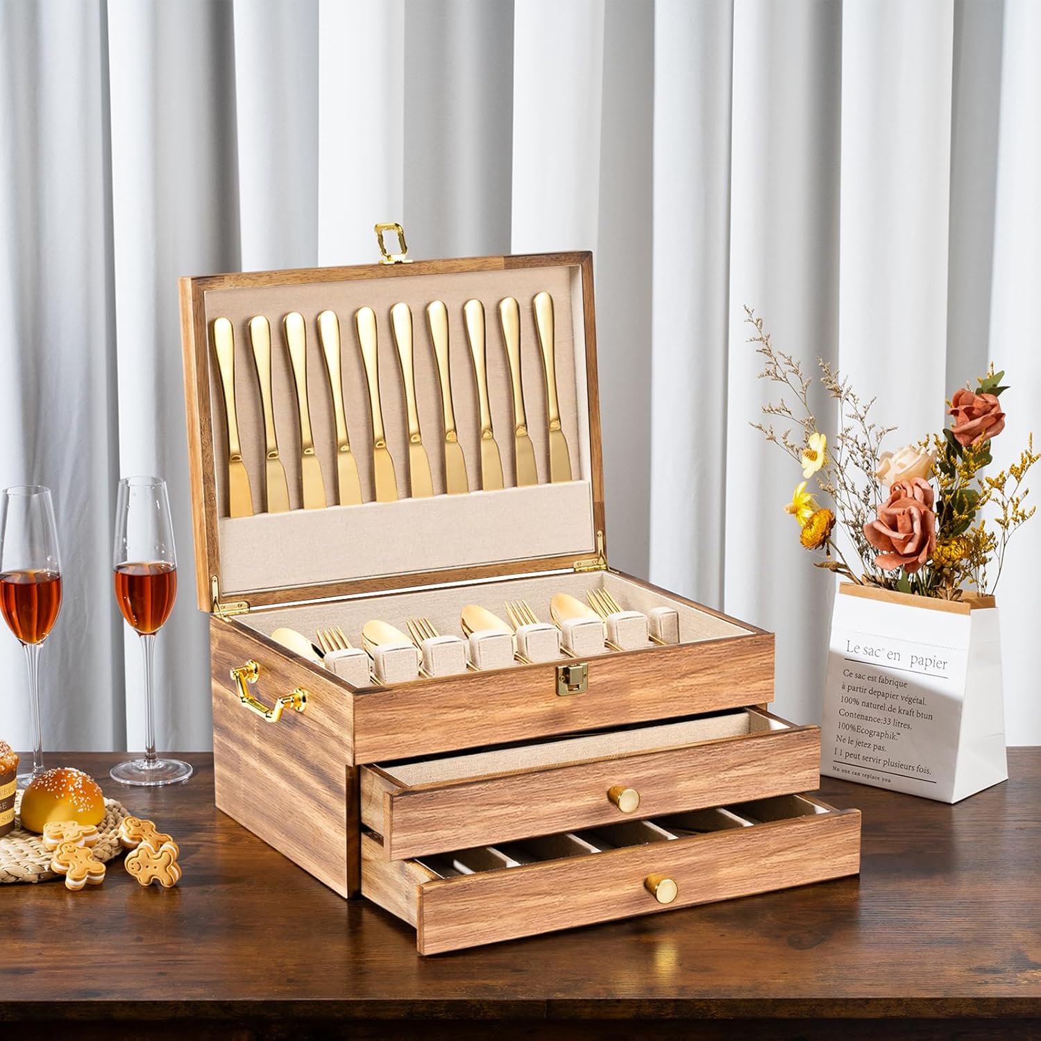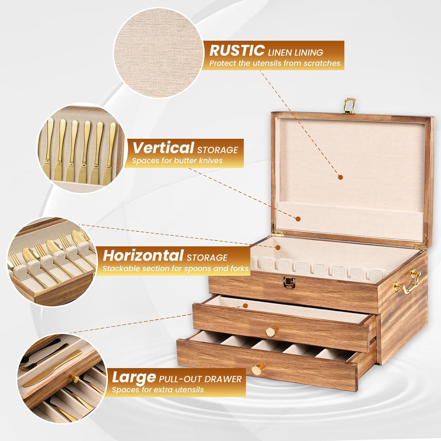 - Authentic Wood Craftsmanship: Crafted from solid wood in a rustic country style, this sturdy and durable silverware chest exudes a sense of luxury. The silverware boxes for flatware features the linen lining to effectively prevent scratching or damage to your silverware, ensuring they're intact for years to come.