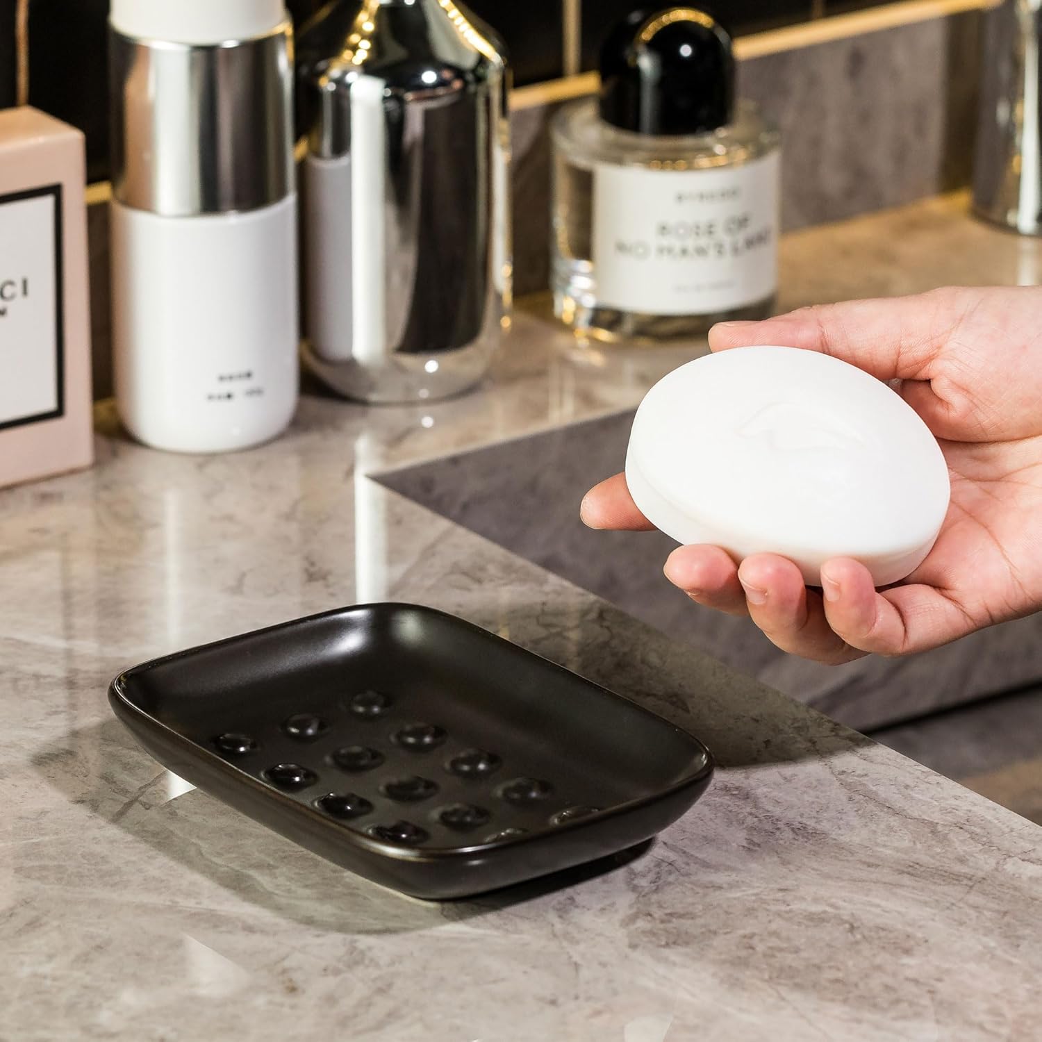 Soap Dish, Ceramic Soap Holder Shower Soap Dish for Bar Soap Sponge, Soap Saver Tray for Bathroom Kitchen Sink, Black