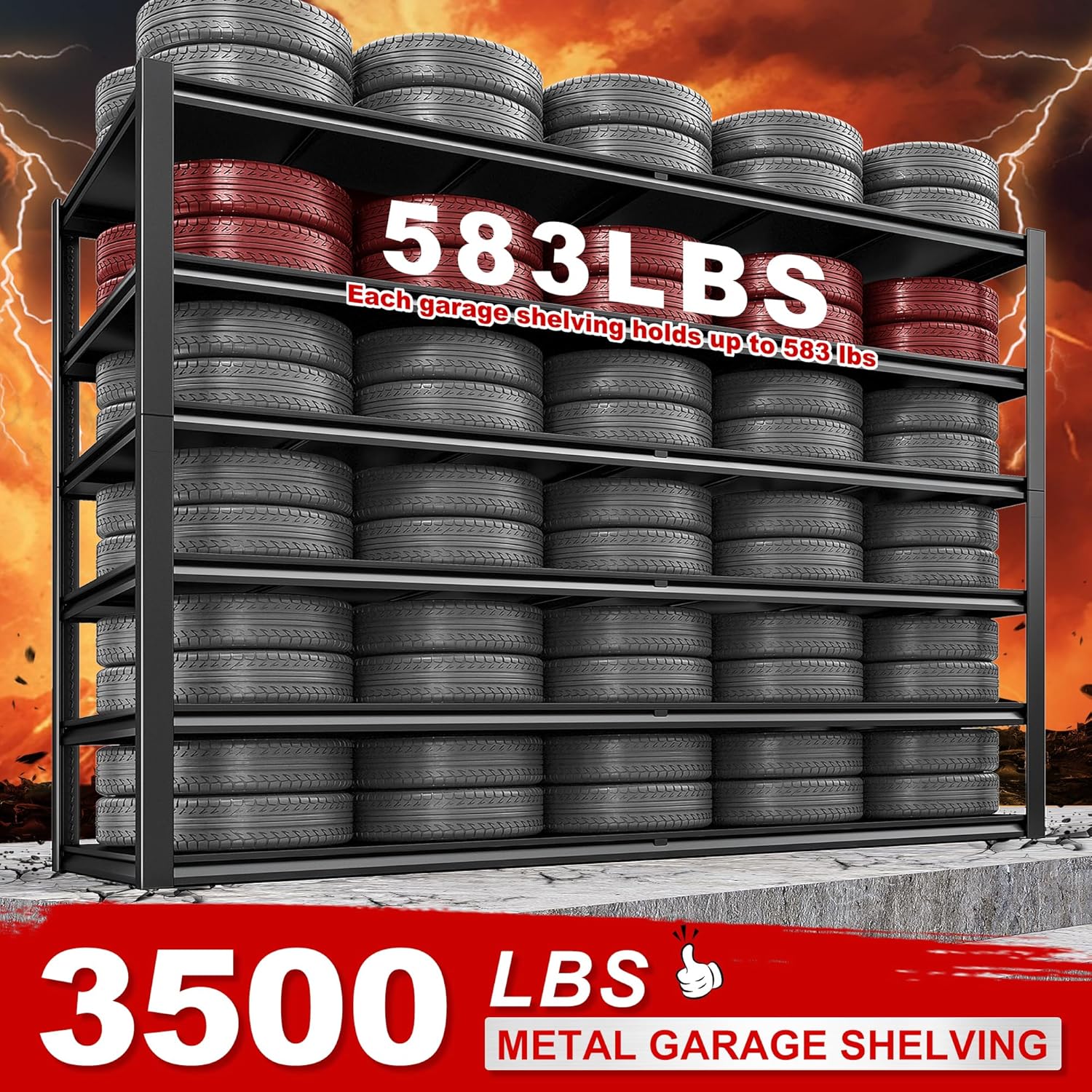 - ă3500LBS Capacity Heavy Duty ShelvingăOur garage shelving is made of high-quality steel material, and double-layer thickened rack. Unlike fragile wooden boards, our storage shelves is durable and solid, with strong ribs under each steel board with a capacity of 583LBS. The metal shelving is not only more sturdy and durable than ordinary ones, but also has a total capacity of 3500LBS to provide excellent support