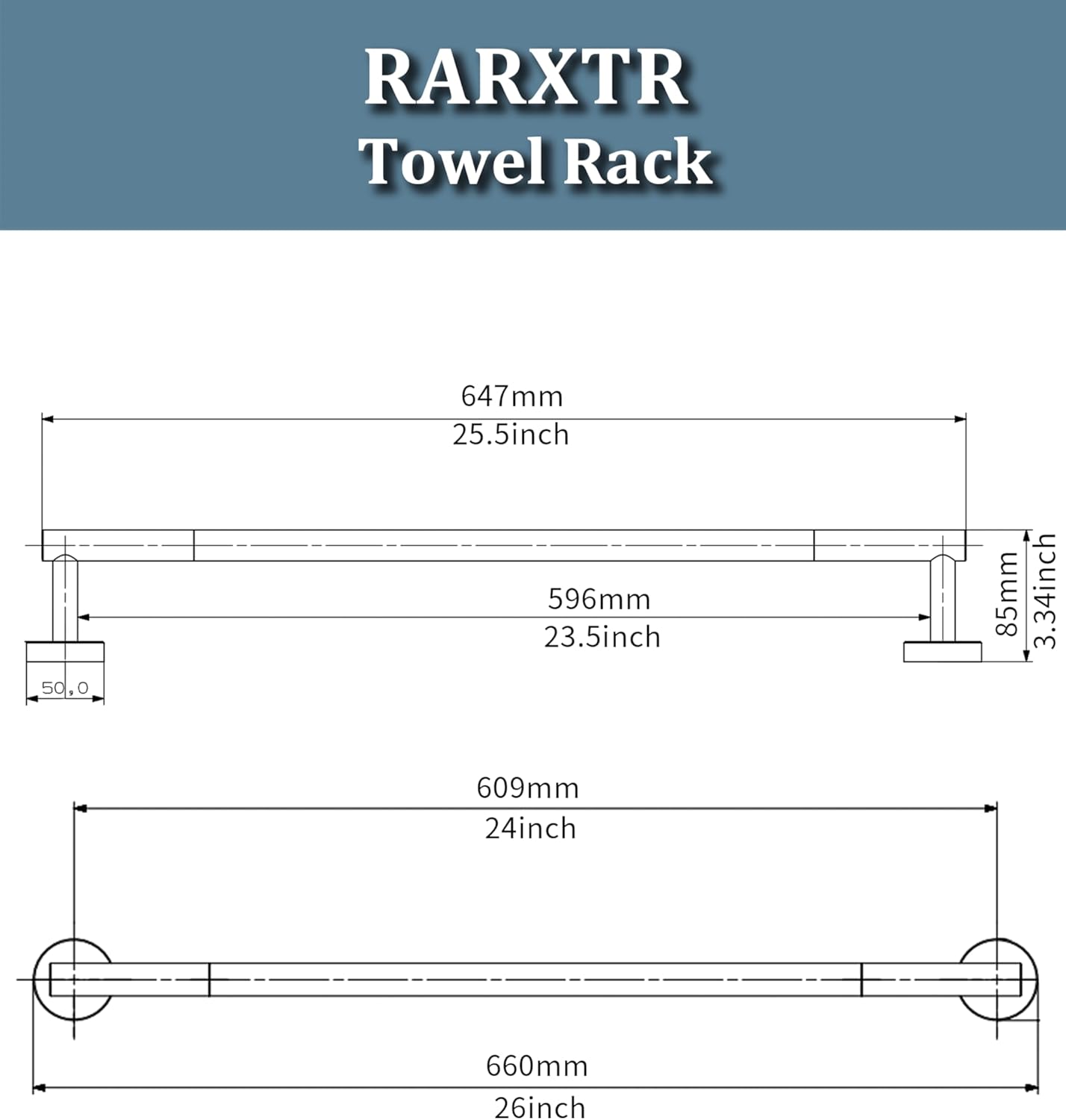 - Note: The black towel rack has an overall length of 26 inches, a center spacing of 24 inches, and the long towel bar consists of three parts.