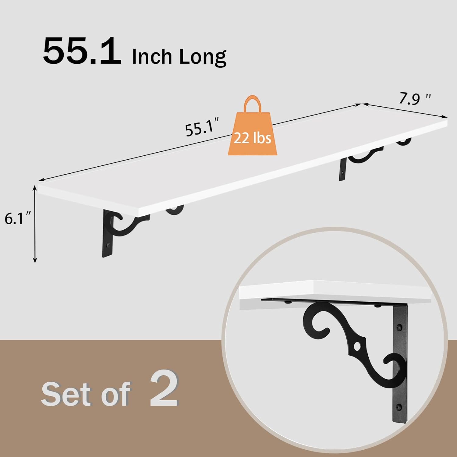 DINZI LVJ Long Wall Shelves, 55.1" Large Floating Shelves Set of 2, Wide Display Shelf Wall Mounted with Brackets, Easy Hanging for Living Room, Toilet, Office, Bedroom, White