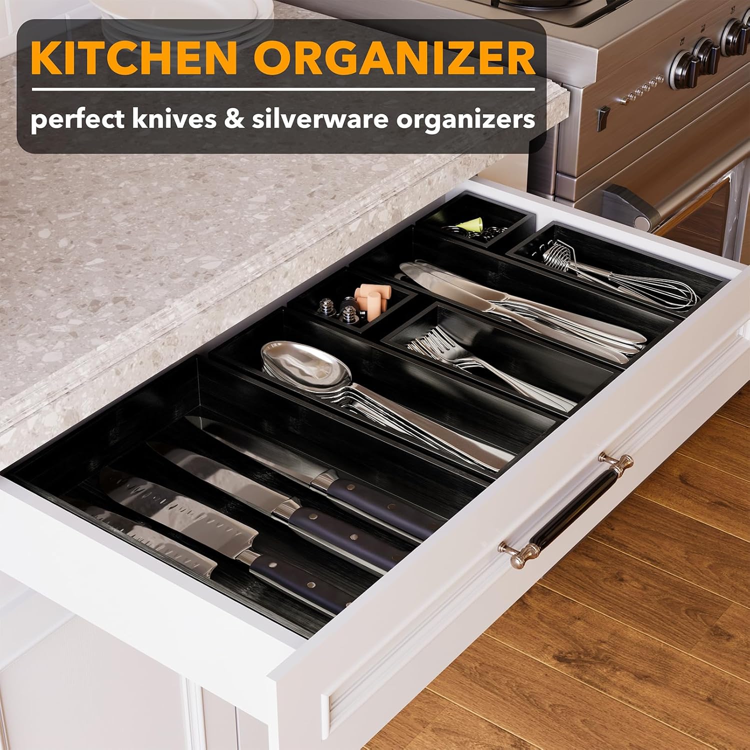 - KITCHEN UTENSILS STORAGE - Designed to hold silverware, utensil, flatware, cutlery, spoons and knives; The bamboo organizer for kitchen storage organization is 1.9" High; MEASURE YOUR DRAWER HEIGHT FIRST