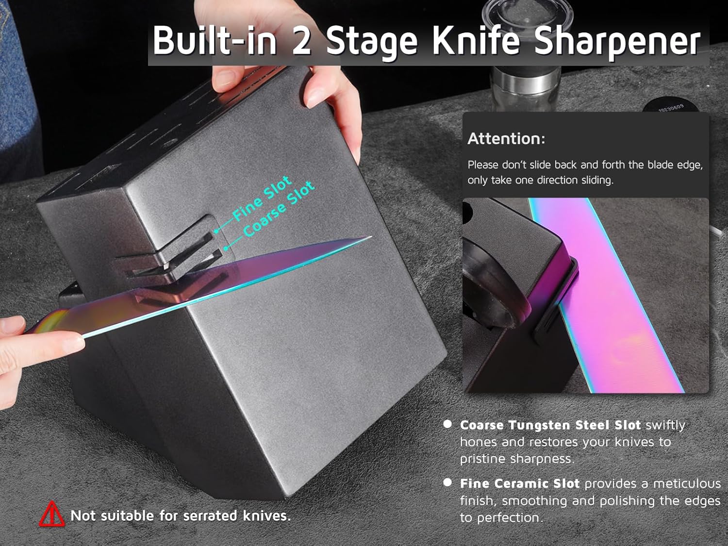 - 【BUILT-IN 2-STAGE SHARPENER】The 2-stage sharpener is built into the slot for easy and super convenient resharpening of your fine edge knives. No need to buy extra sharpener for saving your counter space.