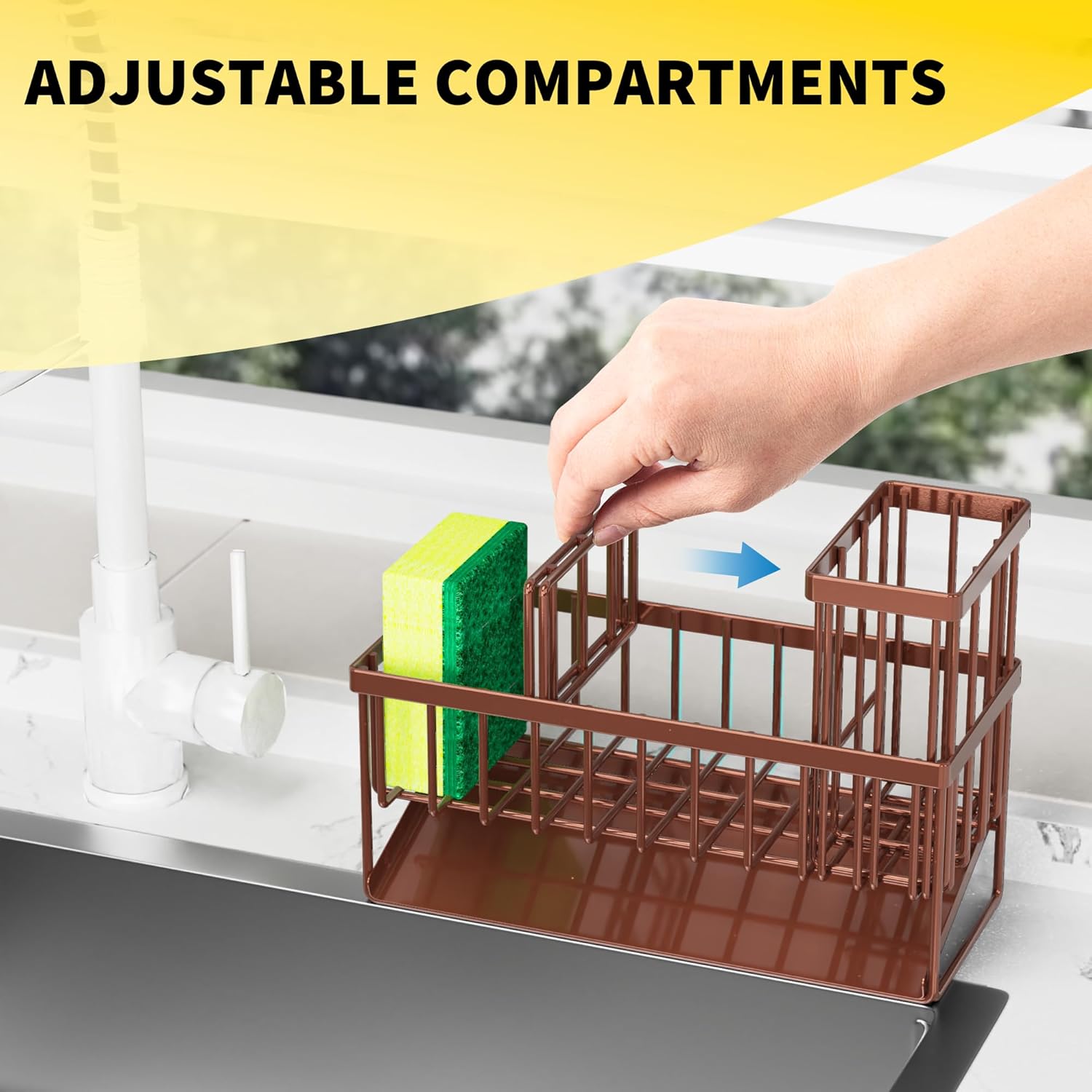 - ăREASONABLE DIVIDER DESIGNă The sponge holder for kitchen sink ergonomic divider design allows it to have 3 separate storage spaces, Different items are placed in different areas. Make the most of every inch of space and make your kitchen look cleaner.