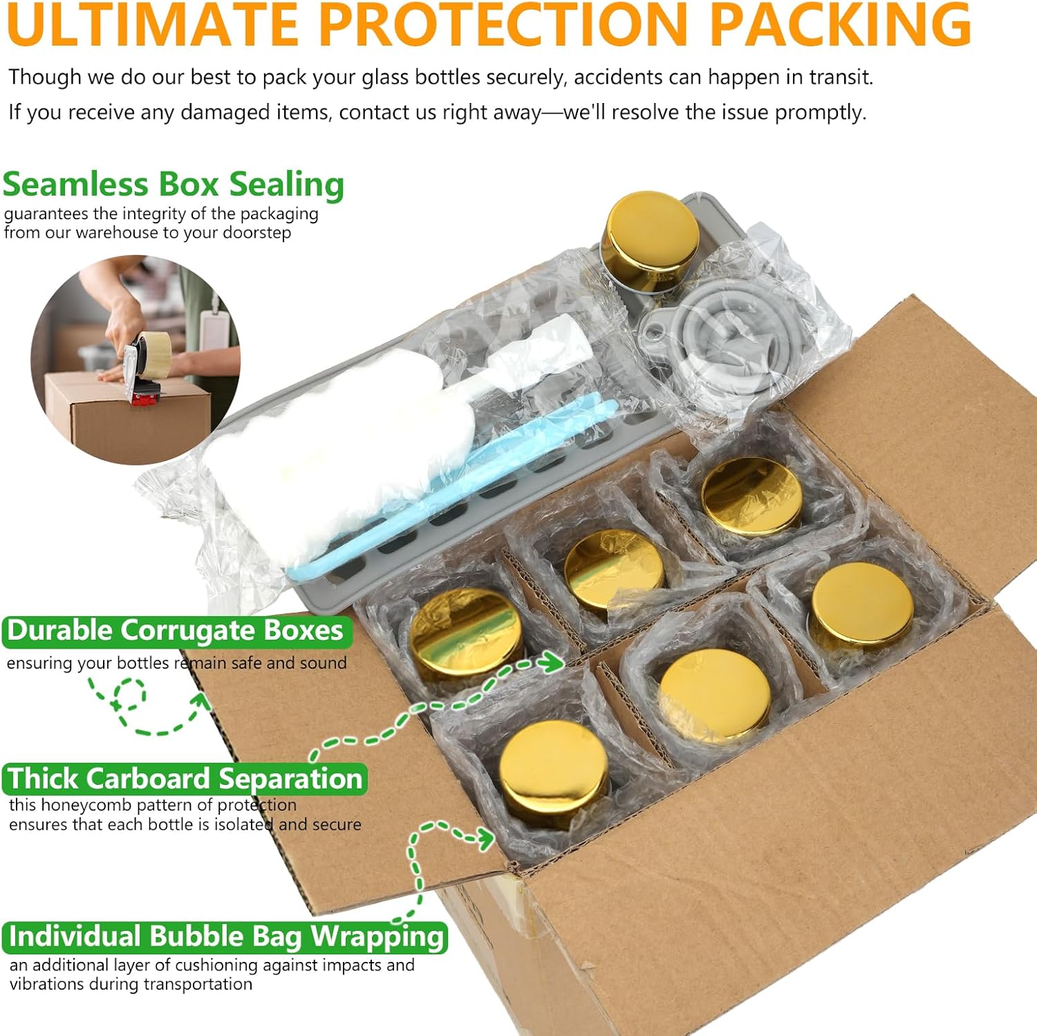 Zukro Glass Water Bottles with Lids 18 oz, Reusable Juice Bottles for Juicing, Leak Proof Juice Storage Containers for Fridge, Clear Drinking Jars With Stainless Steel Caps, BPA Free, Set of 6 Gold