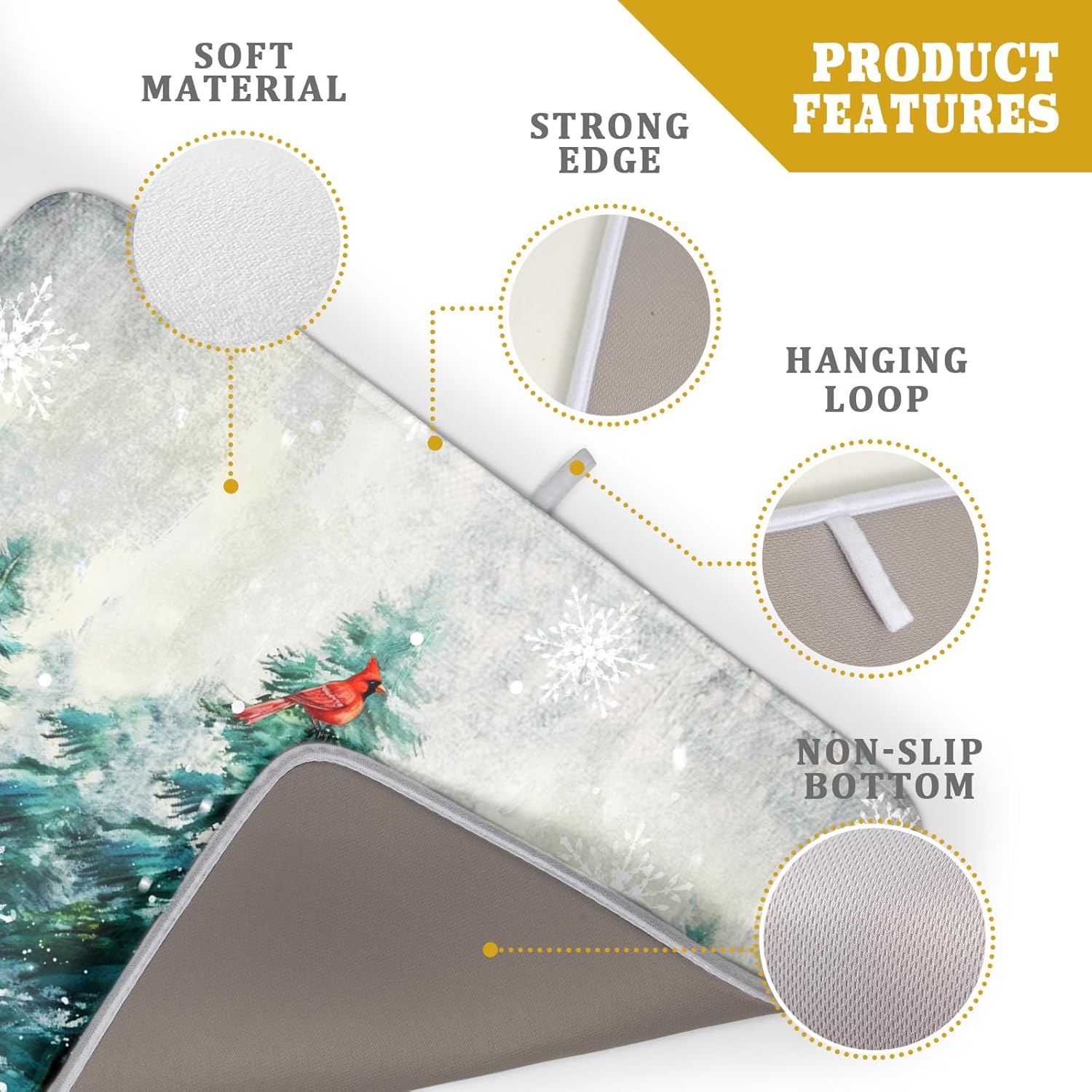 Pine Tree Dish Drying Mat for Kitchen Countertop Red Bird Dishes Mats Winter Decorative Absorbent Reversible Drainer Rack Pad 18x24 Inch