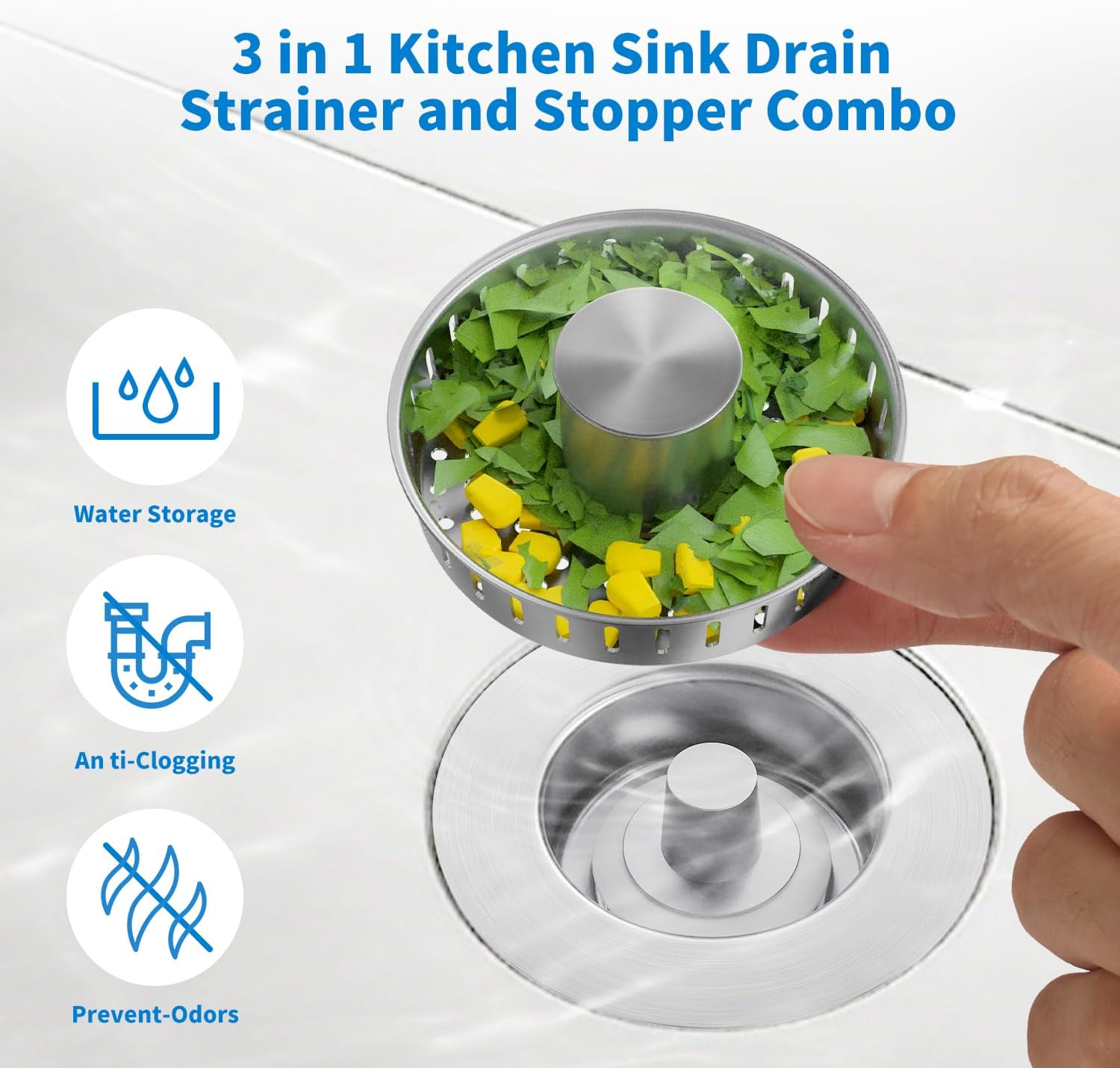 - 3-in-1 Design: Upgraded stainless steel kitchen sink strainer basket can easily filter kitchen scraps, will not clog the basket holes to ensure efficient drainage. Effectively prevents bad odors and ensures that your kitchen smells fresh and clean