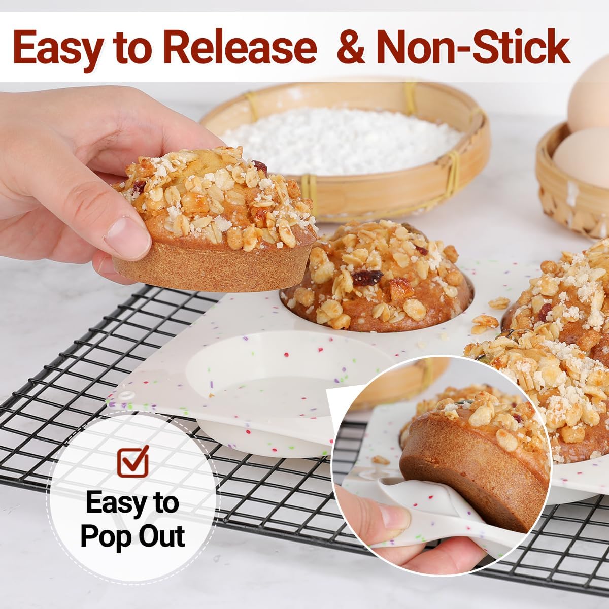 - Non Stick and Easy Release: Polish surface and flexible silicone makes it’s a breeze to pop out, easy to clean thoroughly. It’s more robust than traditional metal baking pan, rust resistant