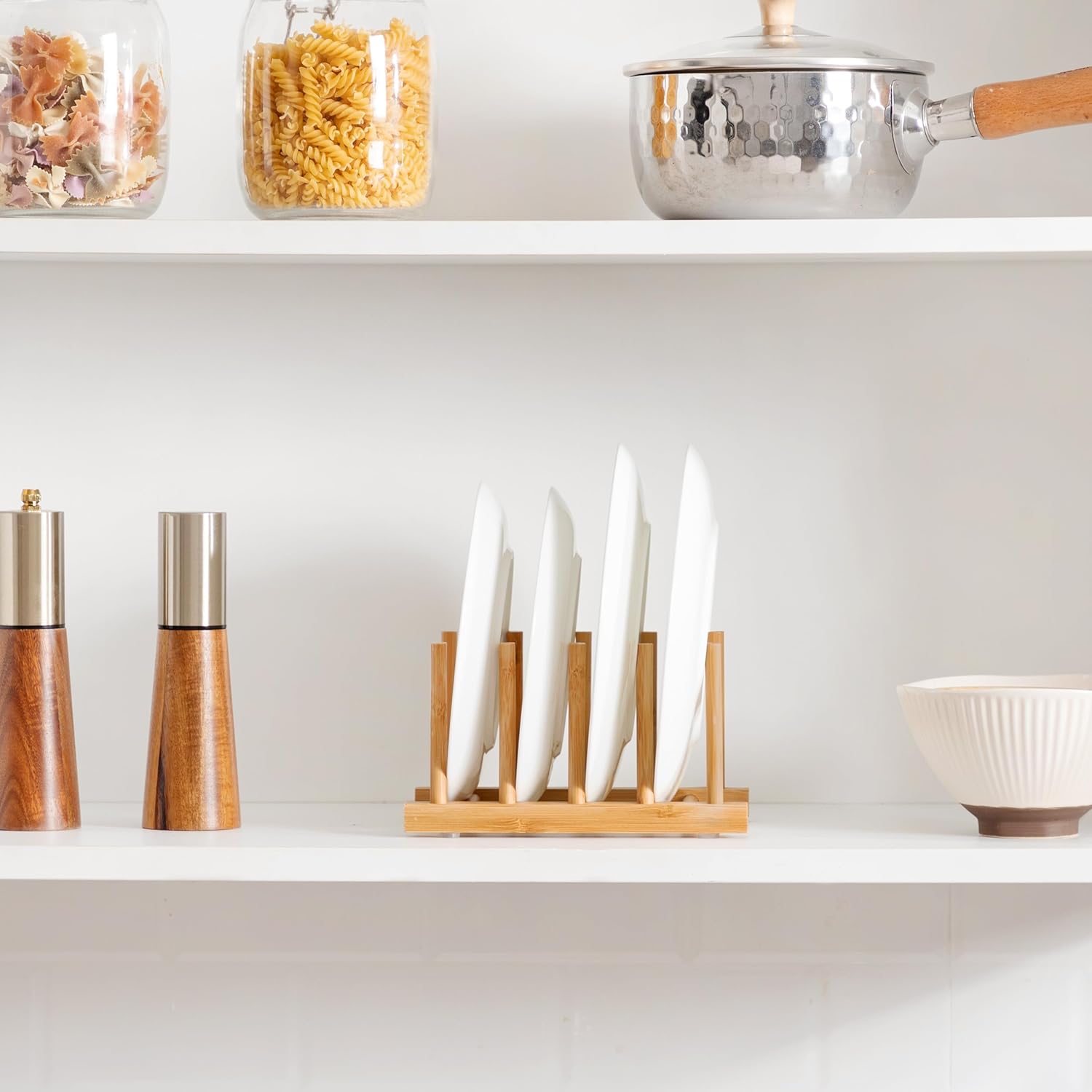 Bamboo Dish Drying Rack for Kitchen Counter and Cabinet, Dish/Book/Plate/Bowl/Cup/Cutting Board/Pot Lid Organizer for Kitchen, Living Room, Study, Display Cabinet (4 Slots)