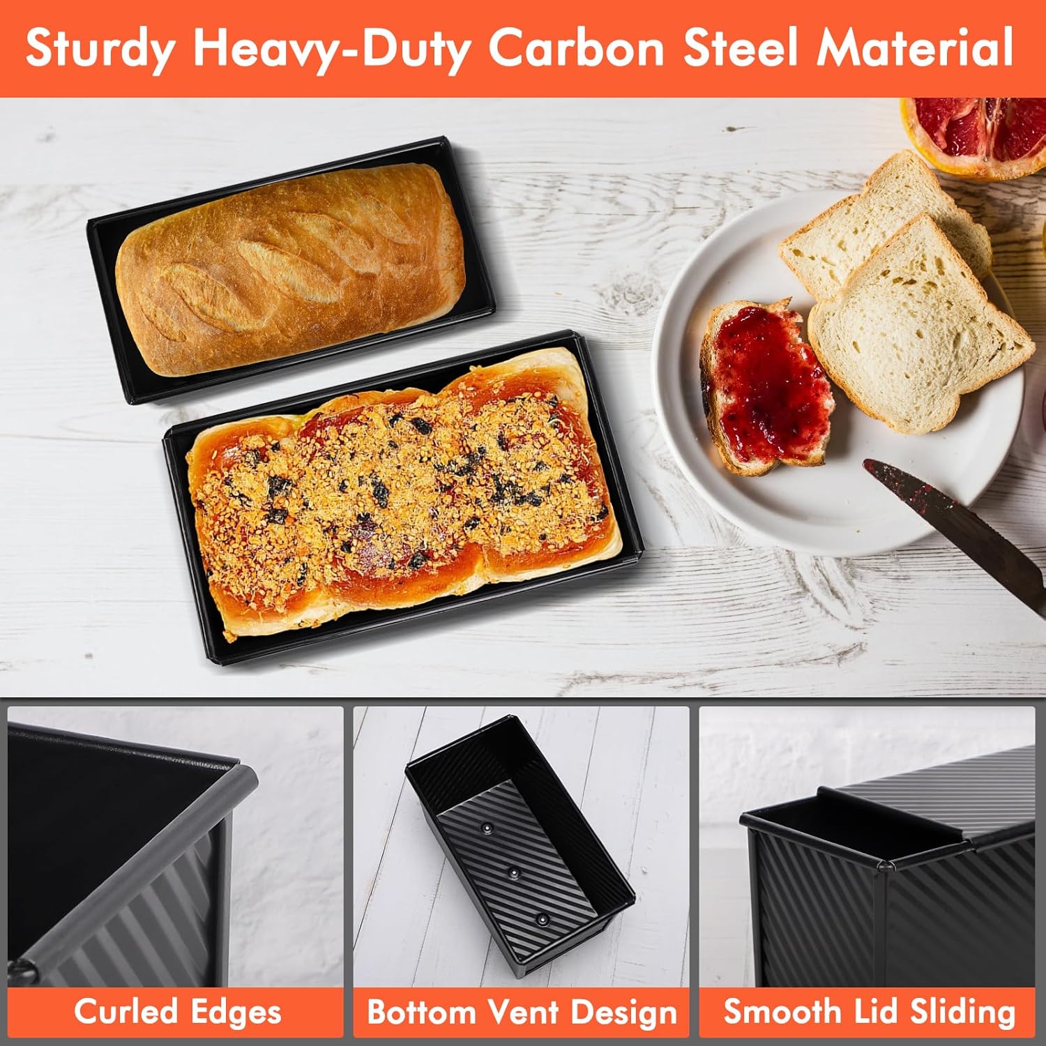 Beasea Pullman Loaf Pan with Lid, 2 Pack Non-Stick Bread Loaf Pans 1 lb & 0.5 lb Carbon Steel Bread Toast Box with Dough Scraper for Homemade Bread Toast Oven Baking - Black
