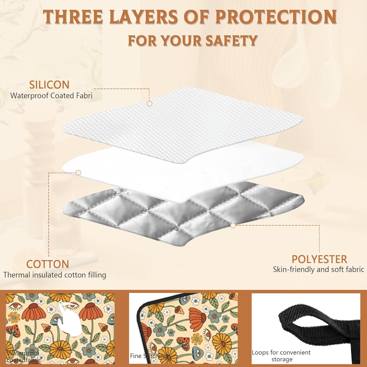 Mushroom Retro Psychedelic Floral Pot Holders Set of 2 Heat Resistant Potholders,Fire Oven Hot Pads for Kitchen Cooking Baking Barbecue