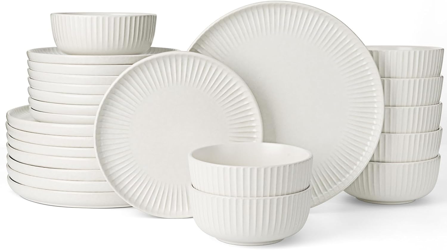 Famiware Starlight Dinnerware Sets, Plates and Bowls Dish Set of 8 (24 Pieces), Ribbed Textured Tableware - Dishwasher & Microwave Safe, Chip Resistant, Reactive Glaze, Matte Reactive White