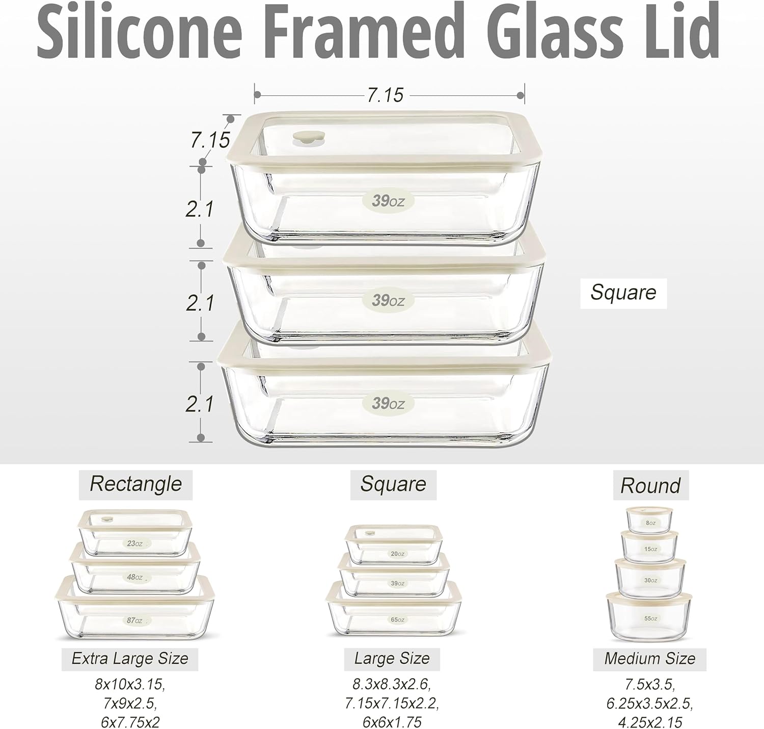 - ✅WHAT’S IN THE BOX: Each set comes with the Glass containers and their matching Silicone Framed Glass Lids. SQUARE Shape Size : 39oz, (7.15x7.15x2.1) There are more sizes, colors, and shapes in other combo sets.