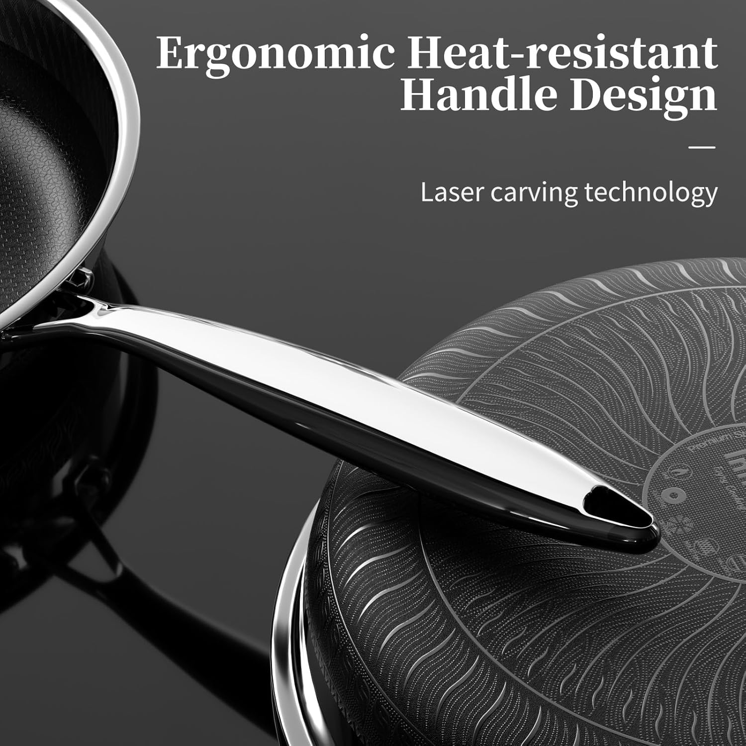 - ăHeat Up Quickly and EvenlyăThe titanium ceramics stainless steel frying pan set with lid has a widened and thickened stainless steel bottom, thickened the wall, which ensures the whole stainless steel skillet pan set fast and even heating, warp-resistance. The unique design of the titanium ceramics honeycomb texure makes the nonstick pan more uniform heated, enjoy your nice cooking journey with the nonstick stainless steel frying pan with lid