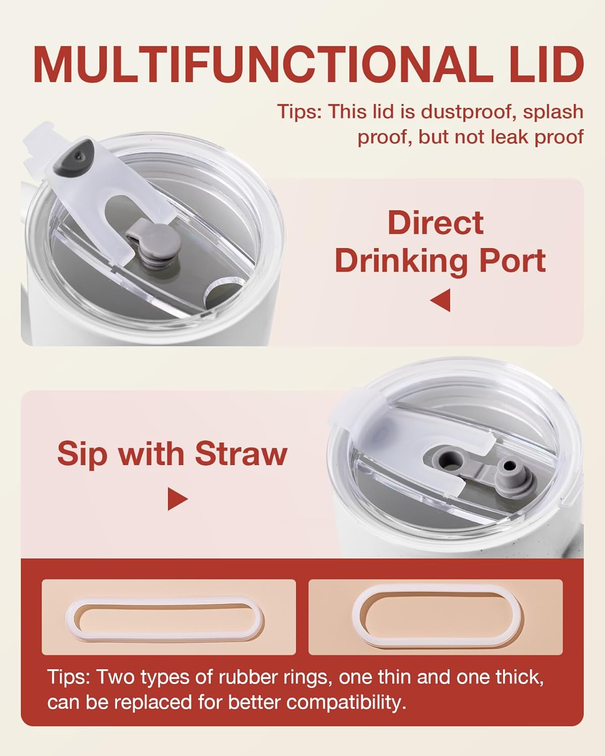 - Splash Proof Lid: with a straight drinking spout and a straw spout. There may be slight differences in the diameter of the ceramic fired cup mouth, including one thin and one thick rubber ring. If one of them is not suitable, the other can be replaced. Please note: This lid is dustproof, splash proof, but not leak proof