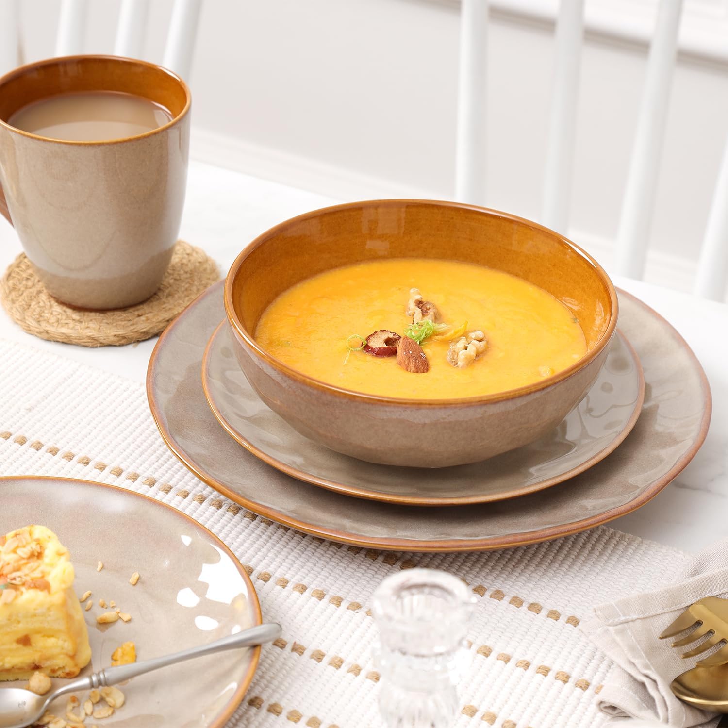 vicrays Ceramic Salad Bowls Set for Kitchen, Serving - 32 Ounce Soup Bowls, Pasta Bowls, Chip Resistant, Dishwasher Microwave Safe, Large, Fluted, stoneware, Set of 6 (Beige)