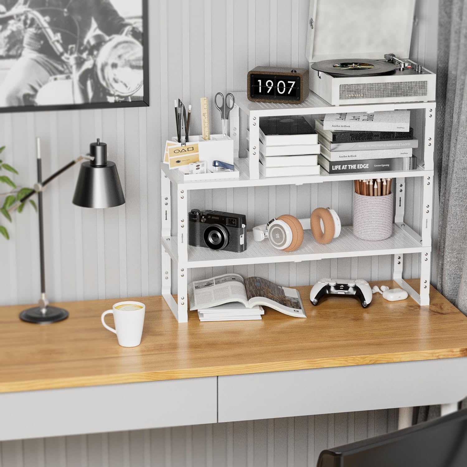 - âăExpandable,StackableăThe shelves can easily expand and contract according to your storage needs, whether it is kitchen clutter or office supplies.You can combine multiple shelves together to form a large storage system, or separate them into several separate smaller units(MeasureïŒ8.11"D x 16.54"W~27.17"W x 8.31"H/7.68"H/7.05"H/6.42"H)