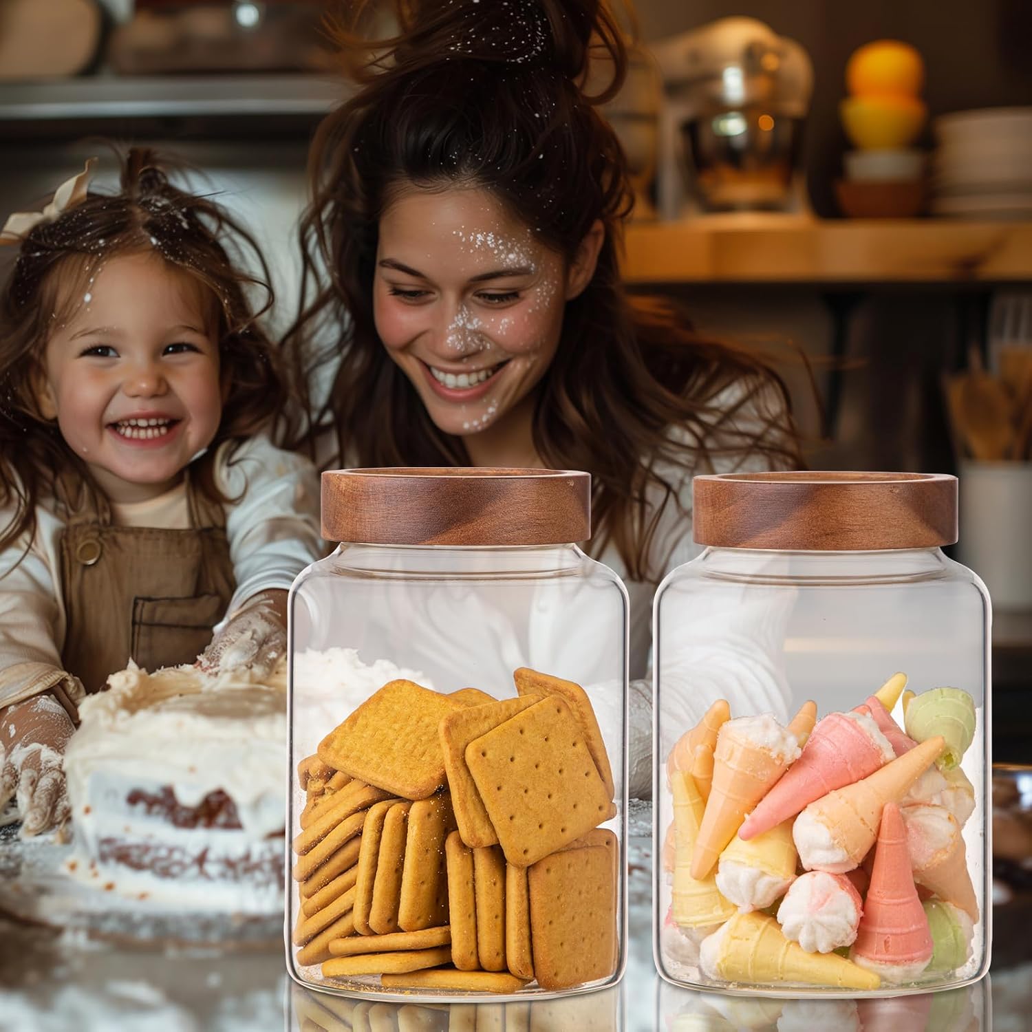 - 【WIDE APPLICATIONS】 Glass kitchen canisters for pantry organization and storage are suitable for storing various dried ingredients to retain their freshness, with clear glass jars, you can easily see inside and quickly find the ingredients you need.Glass jars with wood lids perfect for storing dry food , such as,cookies,dried beans,pepper,oatmeal,jams,chutneys, rice, flour, tea, coffee, biscuits, candy,cheese,flour, sugar, seeds,etc. Keep your kitchen tidy and safe,saving space and convenient .