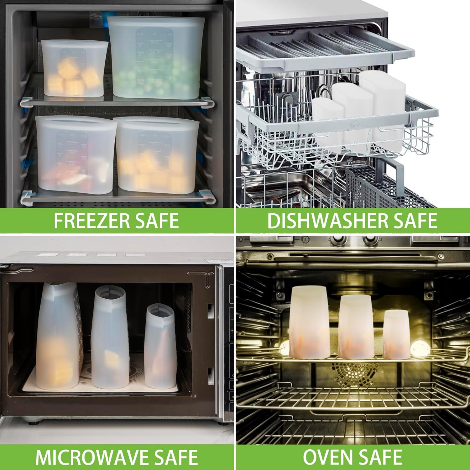- ăDISHWASHER FREEZER MICROWAVE OVEN SAFEăTired of dealing with plastic bags?(PEVA is actually a type of plastic.) Switch to silicone bags reusable storage and spend less time worrying about saving leftovers safely. These reusable bags are non-toxic and safe for use in the Microwave, Freezer, Oven and Dishwasher. They can even withstand temperatures up to 428â, making them ideal for all your food storage needs