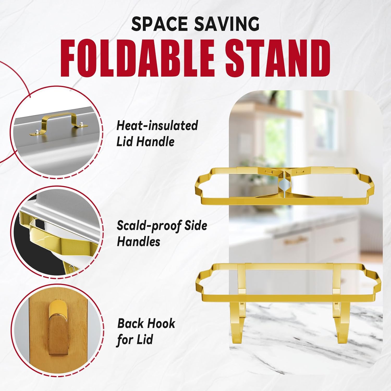 Chafing Dish Buffet Sets of 4, 8QT Stainless Steel Rectangular Chafers and Buffet Warmer Sets for Catering, with Food & Water Pan, Lid, Gold Foldable Frame, Fuel Holder for Event Party Holiday