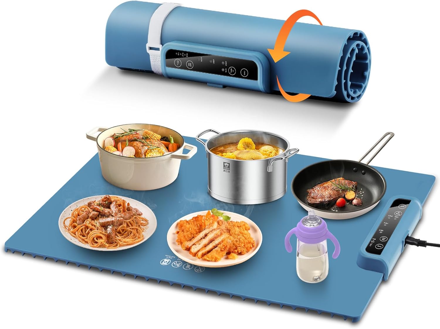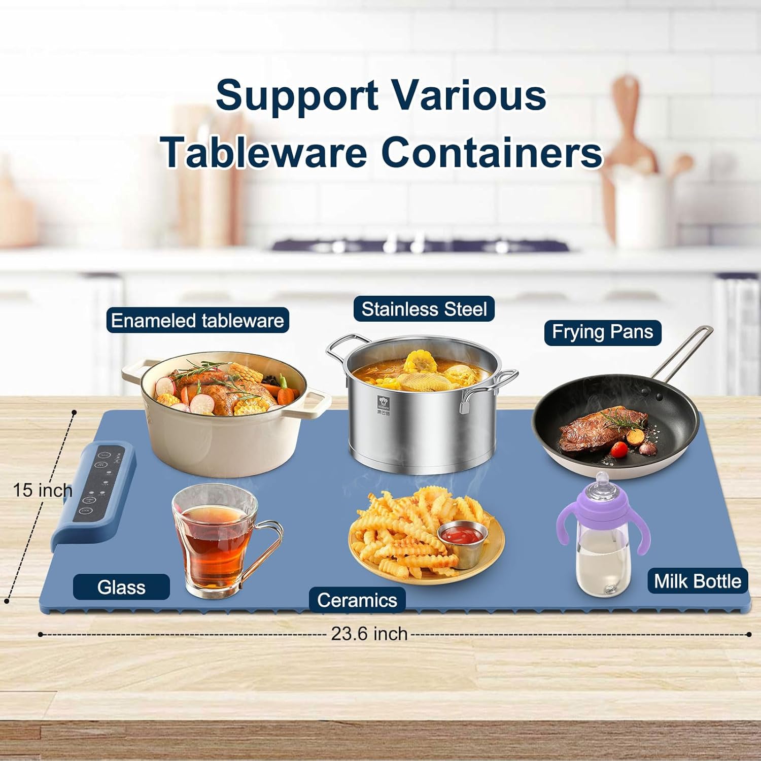 - [Nano-Silicone Easy Clean]: Our electric warming mat for food features premium nano-silicone material, splash, stain, and oil-resistant. Wipe it easily with a damp cloth or paper towel for spotless cleaning. Food-grade and safe for worry-free usage