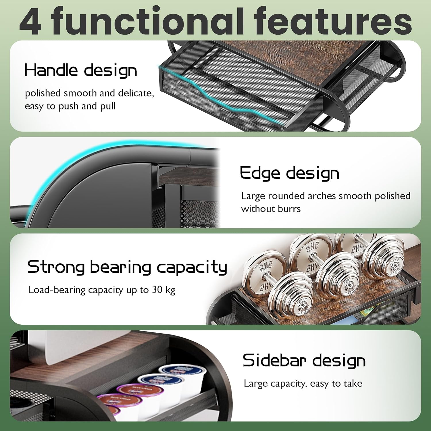 - Multi-purpose: This sturdy drawer is not only store the coffe pods but also a stand for your coffee maker, making it an all-in-one solution for your morning routine. You can also use it as an office desk organizer, a monitor riser, or a printer stand.