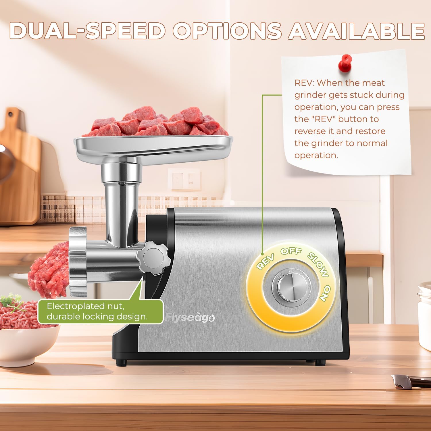 - Compact Design & User-Friendly Features: The compact design of this meat grinder saves countertop space, while the forward and reverse functions prevent jams and make grinding even smoother
