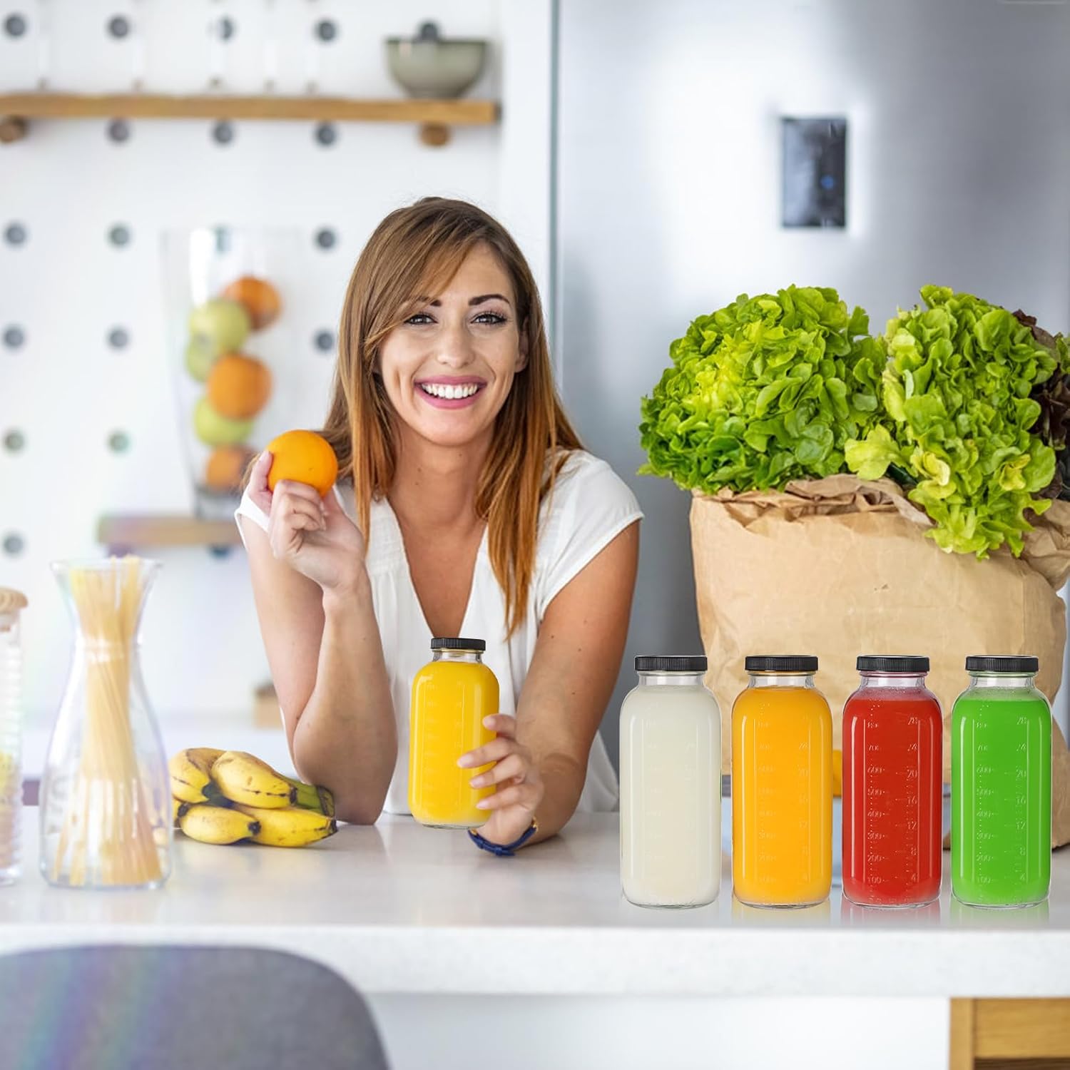 STARSIDE 32 oz Glass Juice Bottles with Lids 2 Pack - Square Reusable Drinking Jars for Juicing, Milk, Kombucha - Includes 1 Bottle Brush, 6 Colored Labels