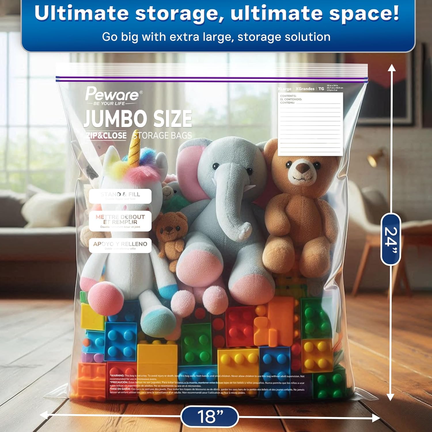 - EXTRA LARGE 18X24 INCHES SIZE: Perfect for storing bulky items like blankets, pillows, or large batches of food. With a 5-gallon capacity, these bags are the ultimate solution for heavy-duty storage needs.