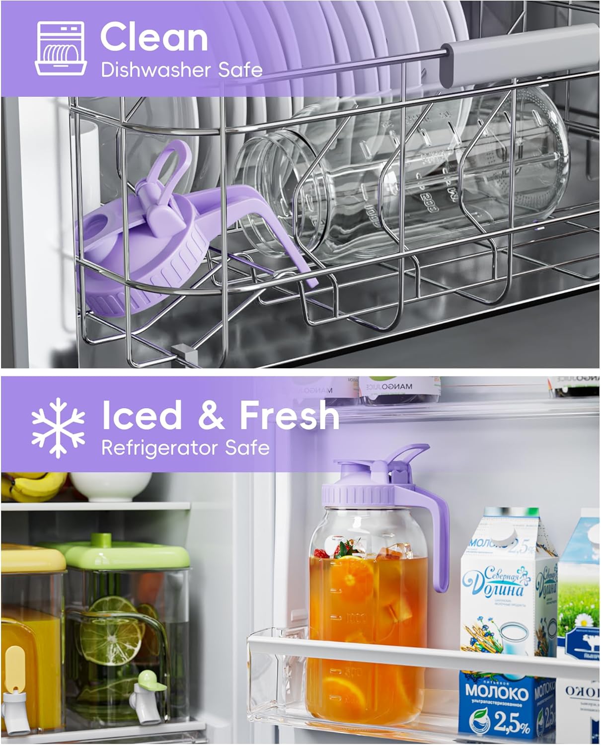 - Premium Quality Glass Jug: This glass water pitcher is crafted from high-quality, food-grade glass that is durable and resistant to breaking. Both the glass jar and lid are free of lead, cadmium, and BPA, and are odorless, ensuring that your drink's taste is not affected. The pitcher is refrigerator-safe and dishwasher-friendly