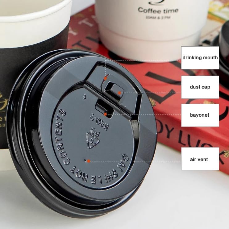 - Leak-Resistant and Durable – The black lids form a secure seal with the 12oz paper coffee cups, preventing leaks and spills while maintaining the temperature of your favorite drinks