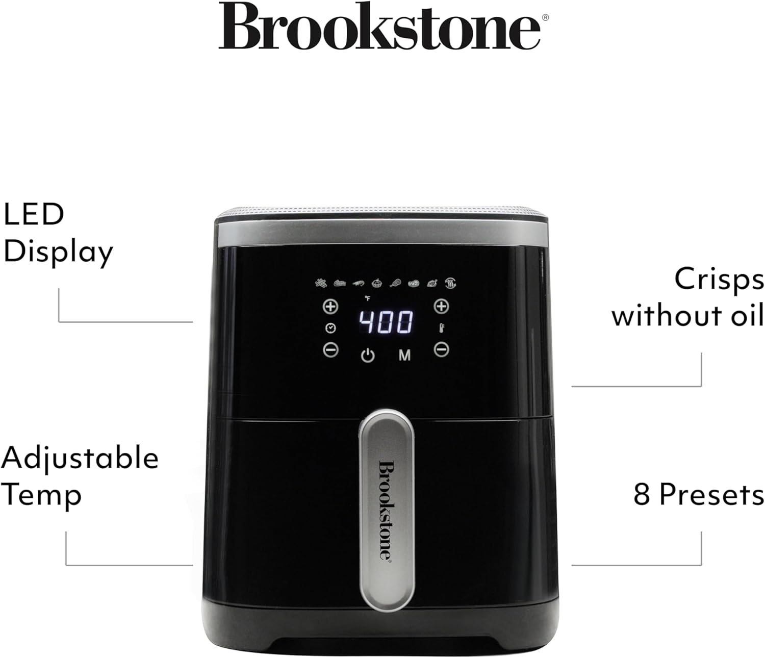 Brookstone Air Fryer – 4.5 Qt, 1300W Large Capacity Fryer with LED Display, 8 Presets, Adjustable Temp, Oil-Free Kitchen Appliance for Baking, Roasting, Frying, Healthy Crispy Meals, Black