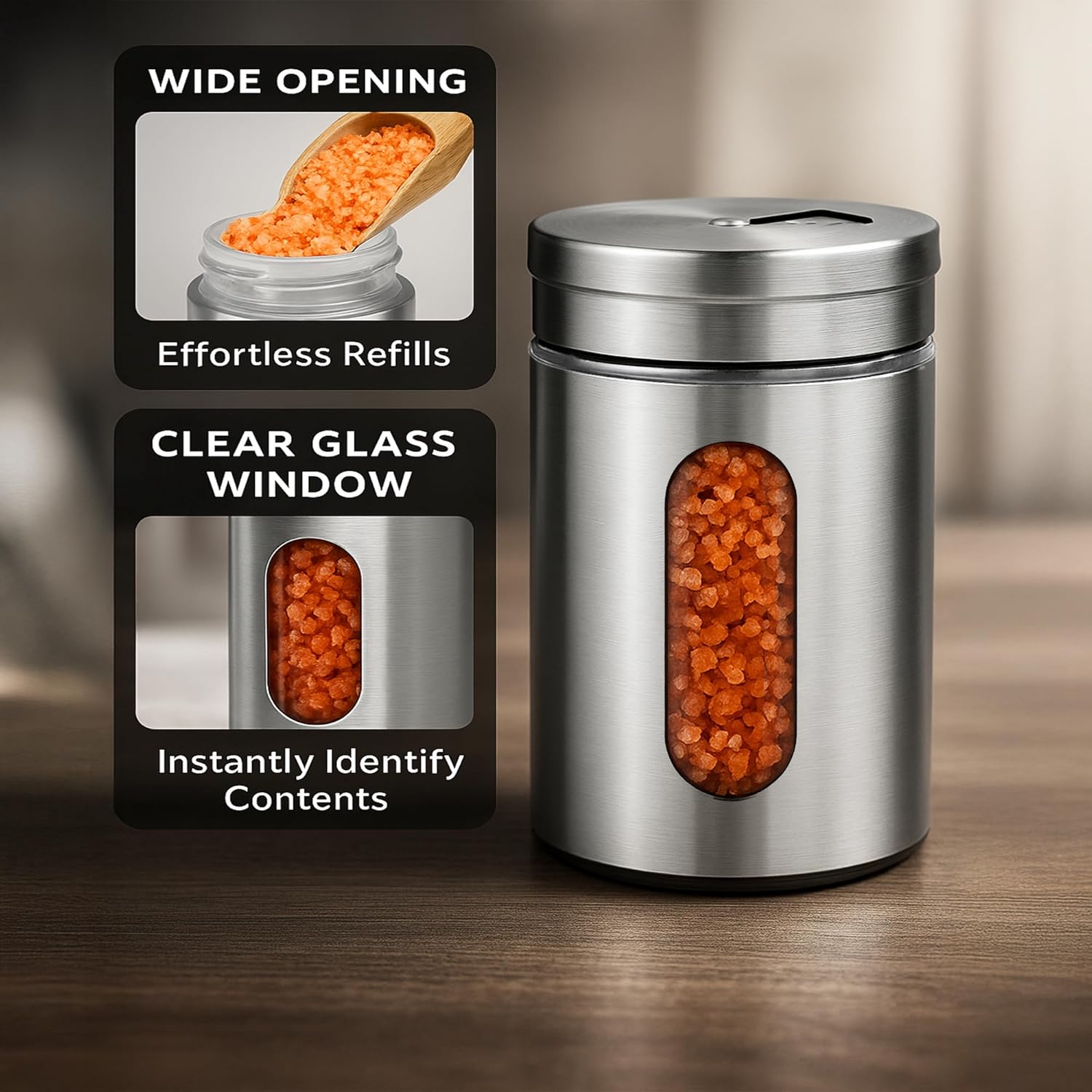 4-Piece Premium Stainless Steel Salt and Pepper Shakers Set – Adjustable Pour Holes Spice Dispenser for Salt, Sugar, Cinnamon, and Pepper – Stylish Kitchen Seasoning and Spice Shaker Set