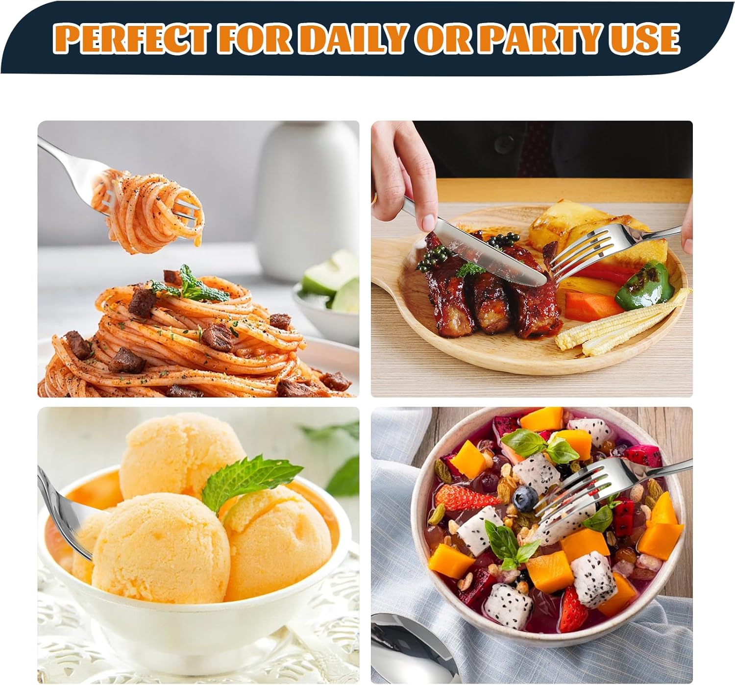 - HEAVY DUTY SILVERWARE SETS: The flatware set is thickened and weighted design to stand up to the rigors of everyday use. Each kitchen silverware sets weighs 0.8 lbs. In particular, the inside of the fork is carefully polished and smoothly rounded for a more comfortable and safer dining experience. The handle of the spoon, on the other hand, is more warped and thicker for easy gripping, while the bowl of the spoon is deepened to hold more food.