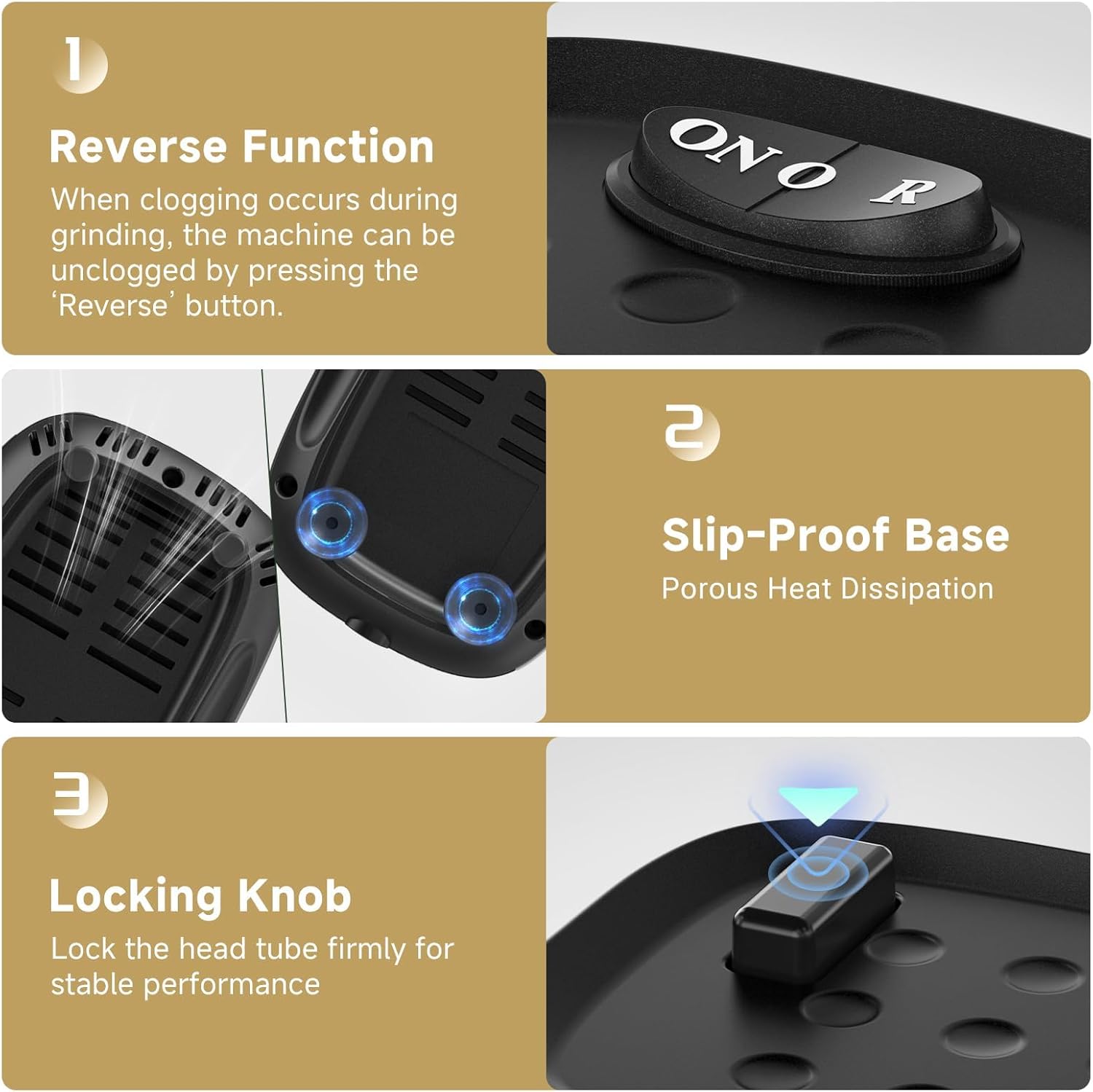 - Safe & Thoughtful Design: The locking knob and overload protection provide safety for use. With a thermostat system, an automatic built-in circuit breaker for protection can prevent the motor from overheating.Press the βReverseβ button feature for unclogging the machine.Tip: Avoid grinding meat with bones,tendons, or skin to prevent from jamming